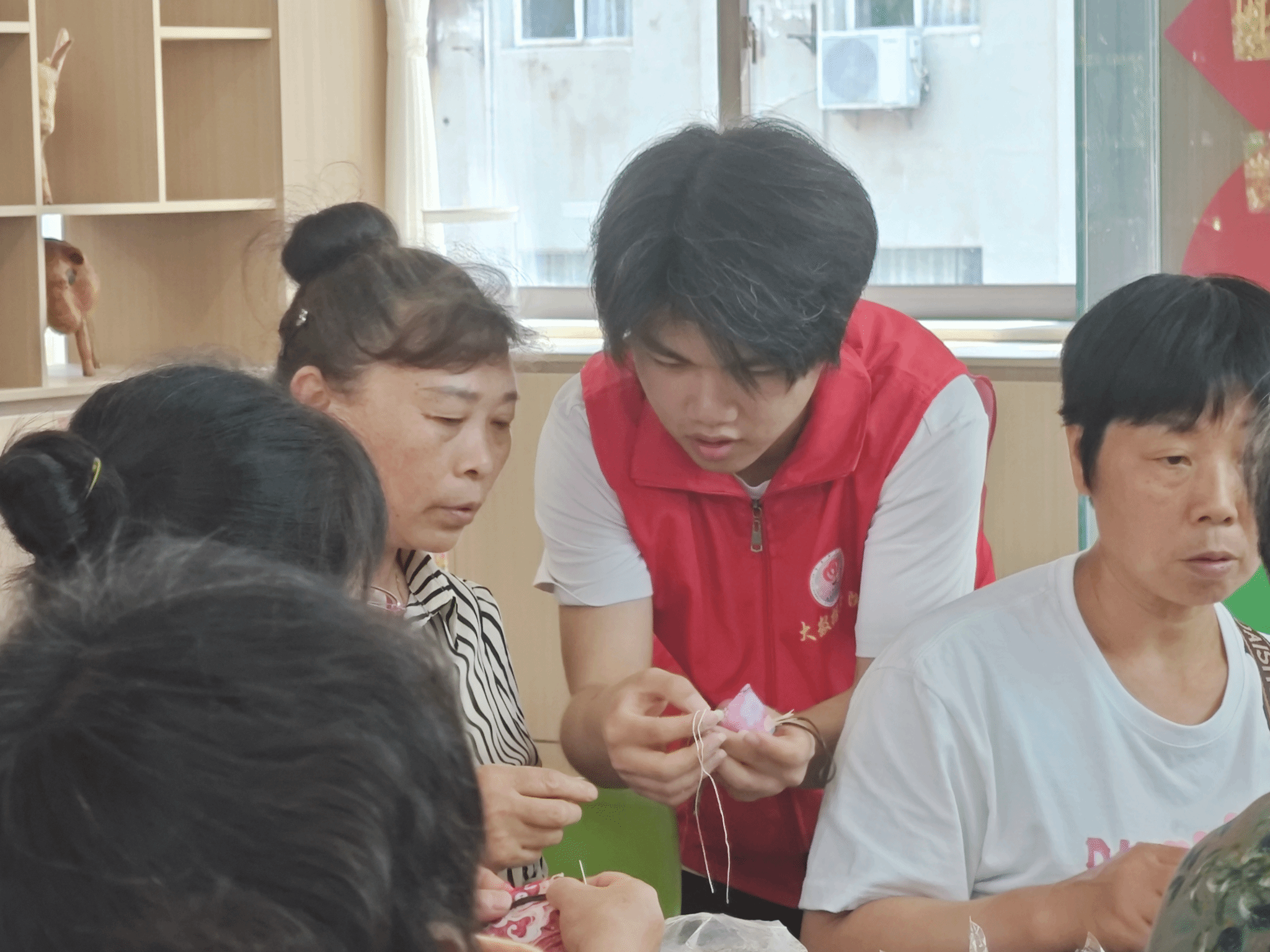 随后,工作人员向老人们介绍了香包制作方法及艾香的历史渊源。作为我国传统香品,艾香具有驱蚊、辟邪、安神等功效,在端午节等传统节日中应用广泛。紧接着,活动进入手工制作环节。工作人员为每位老人分发艾草粉、针、线等制作材料与工具。在工作人员的悉心指导下,老人们认真地进行缝合、填充艾草,每一个步骤都一丝不苟。制作过程中,大家相互交流、彼此帮助,现场氛围温馨融洽。