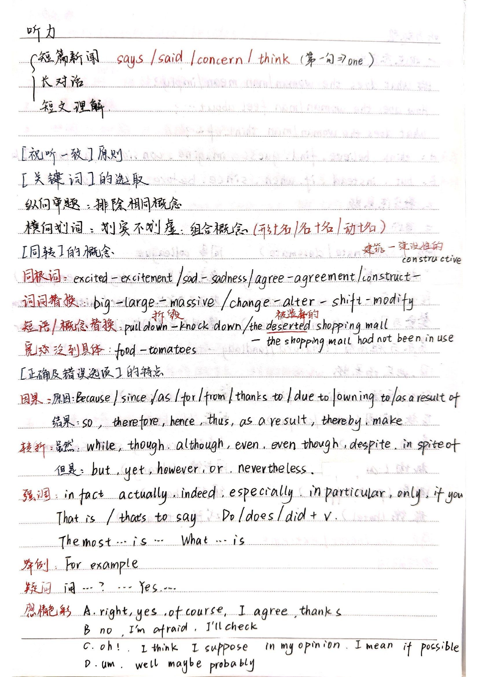 另一位同学分享四级听力技巧时,先指着笔记里的“视听一致”“关键词提取” ,说这是基础逻辑。讲短篇新闻、长对话等题型,强调抓says、think这类表意词。分析同根词、词块替换,像excited - excitement这类变形,big - large - massive这类同义,还有pull down和knock down的短语替换,教大家听时快速反应。说到选项陷阱,用因果、转折、强调词举例,提醒听到because、but、in fact就得支棱起来。现场同学边记边试,直呼:“原来听力不是听个响,跟着笔记抓这些点,好像能‘解码’啦!” 技巧结合笔记,实用又好懂,学习热情直接拉满~