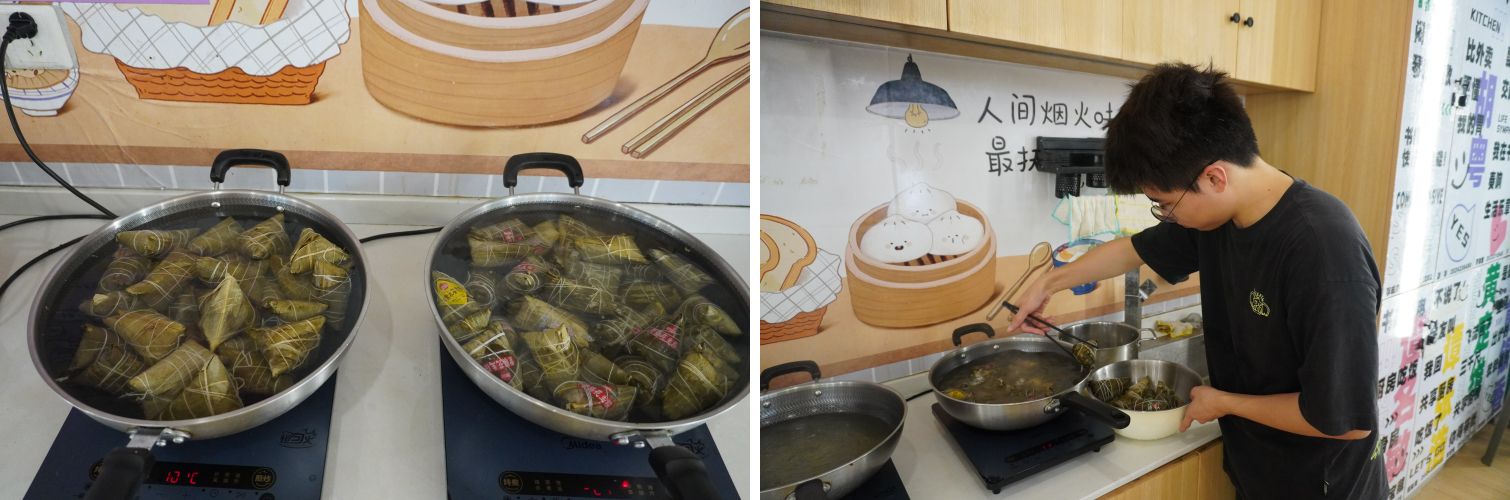 活动当天,谢老师与学生们一起动手煮粽子,共享厨房里香气四溢。尽管粽子已经提前备好,但师生们依然兴致勃勃地参与其中,一边等待粽子加热,一边交流端午节的习俗与各自家乡的过节方式。谢老师也借此机会关心学生的近况,了解他们的生活、心理状态和未来规划,现场氛围轻松而融洽。