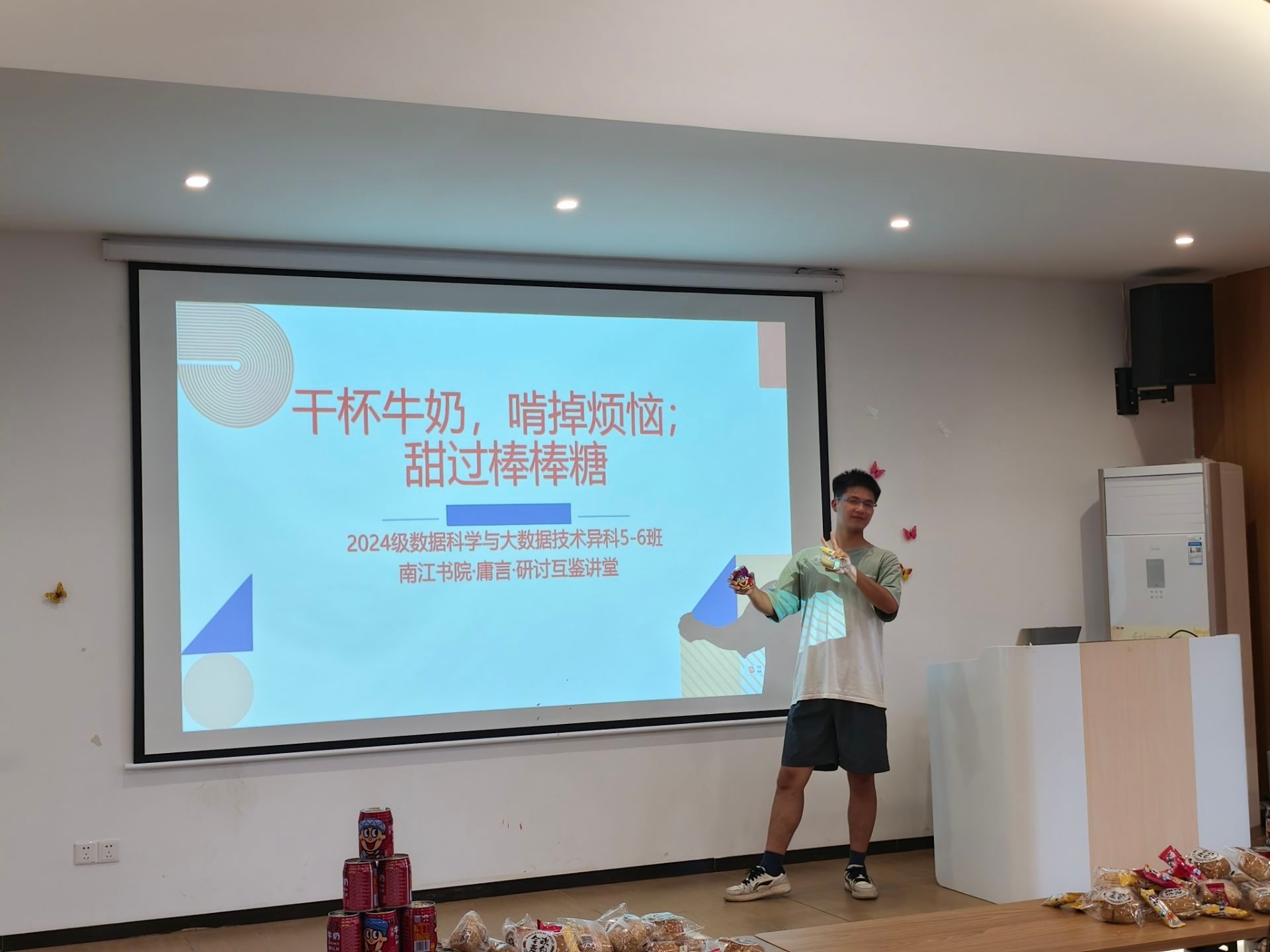 为缓解学业压力,重温童年纯真,2025年6月3日晚,大数据学院数据科学与大数据技术2024级异科5-6班在南江书院庸言·研讨互鉴讲堂举办了一场别开生面的“六一儿童节”主题活动。活动以“干杯牛奶,啃掉烦恼;甜过棒棒糖”为主题,通过趣味游戏、童年回忆分享和甜蜜互动,让同学们在忙碌的学业中找回童趣,释放压力。