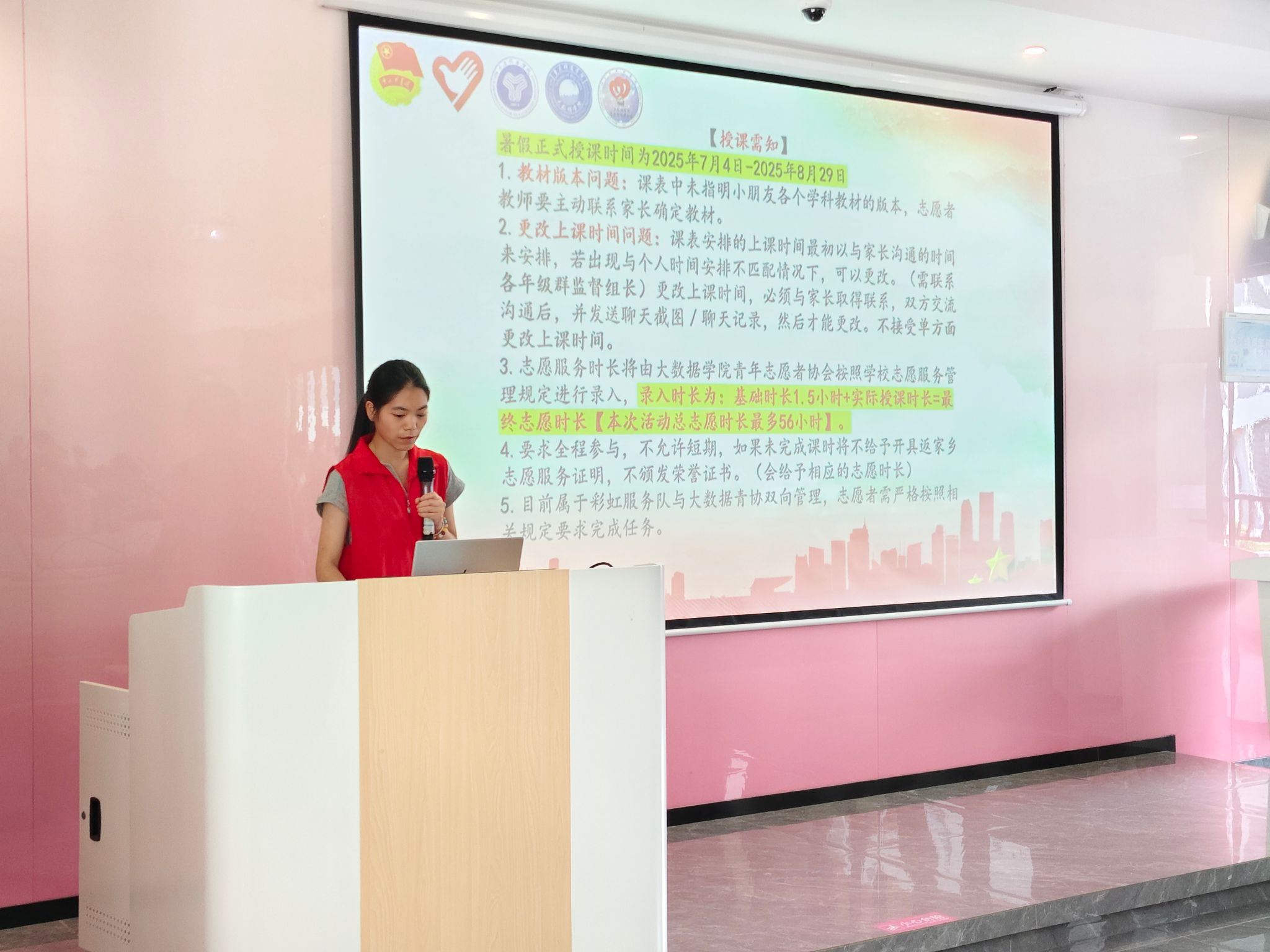为扎实推进“青携彩虹,伴你成长”线上公益辅导活动,2025年6月23日,大数据学院青年志愿者协会在丁山书院处女座˙智慧教室开展2025年暑期线上公益辅导活动培训会。