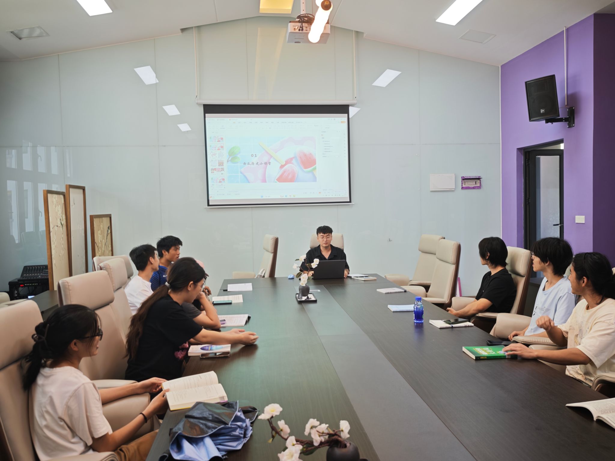 夏日阳光灼灼,热情与清凉却在6月13日下午的观云小雪会议室与共享厨房完美交融。由异科导师郭福禄精心策划的“心有所暑·瓜分一夏”夏日西瓜主题活动成功举办,为师生们带来了一场沉浸式的避暑文化盛宴,现场充满欢声笑语与知识碰撞的清凉风暴。