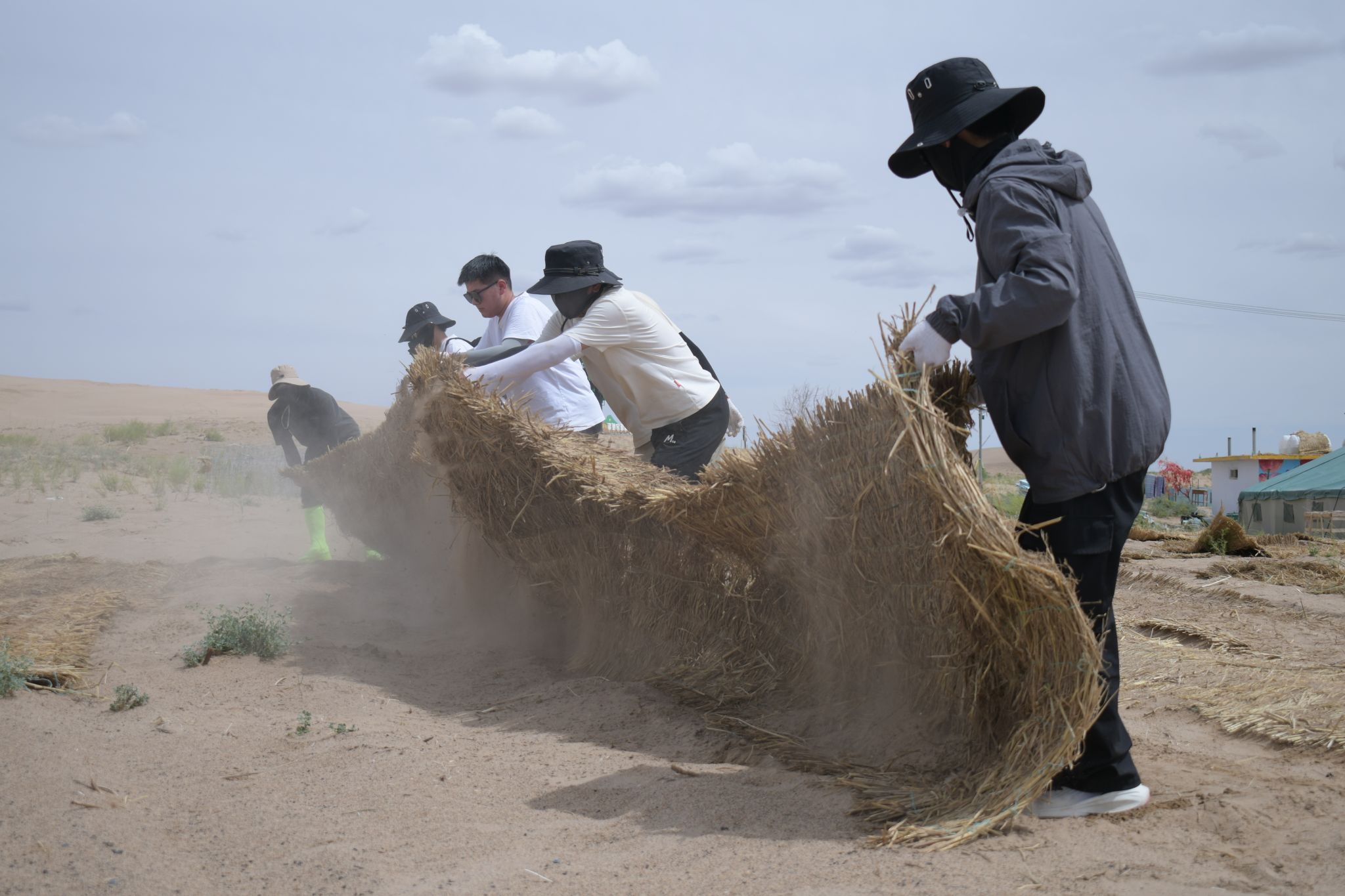 此外,团队发挥专业优势,为治沙防沙基地帐篷覆盖防晒网、修葺草垛,将帐篷改造成“保鲜库”,延长蜜瓜保鲜期,助力基地增收。治沙基地的每一寸土地都留下了我们奋斗的足迹,未来,无论是基地还是民勤,哪里有需要,我们都会第一时间响应。