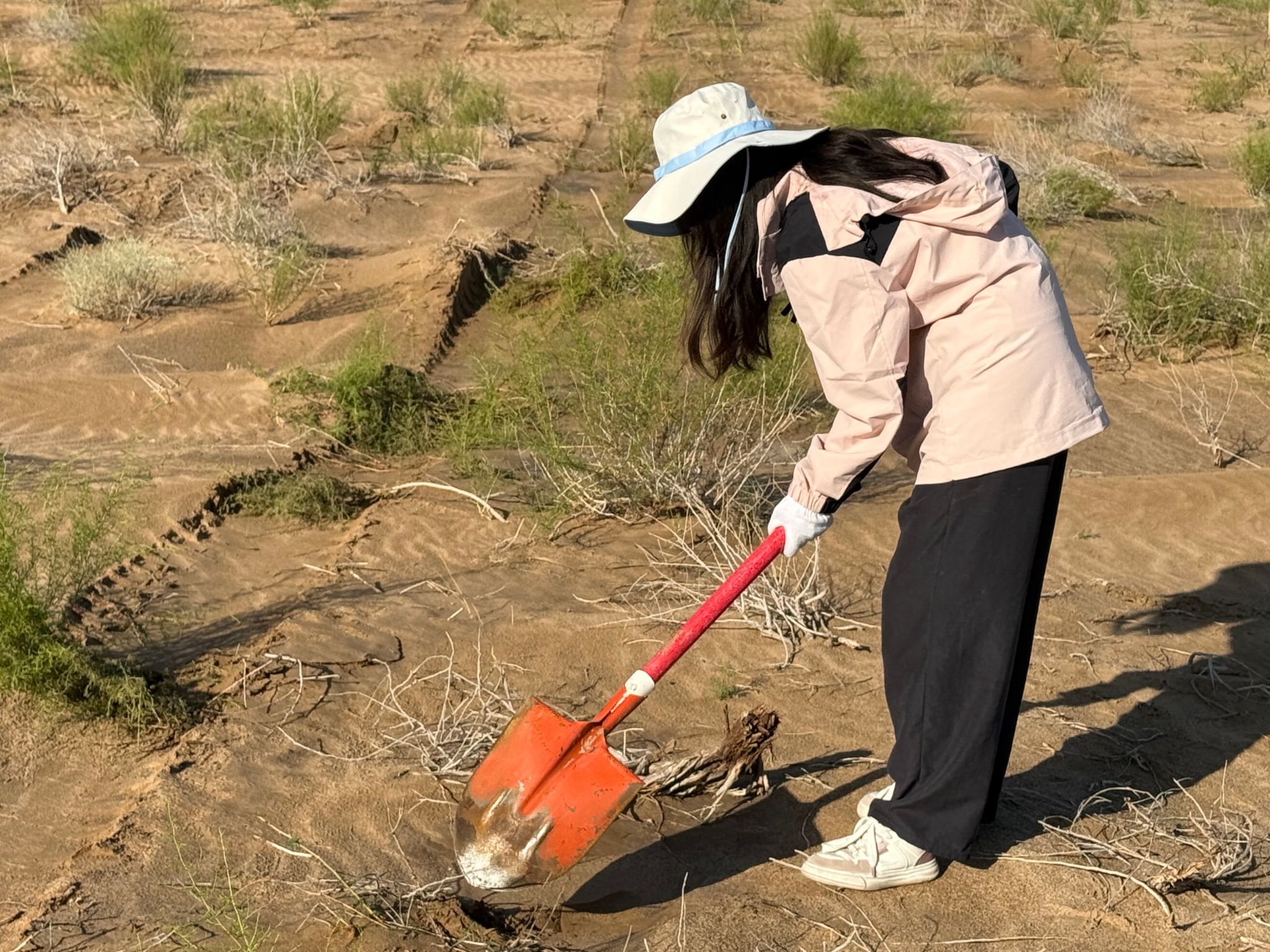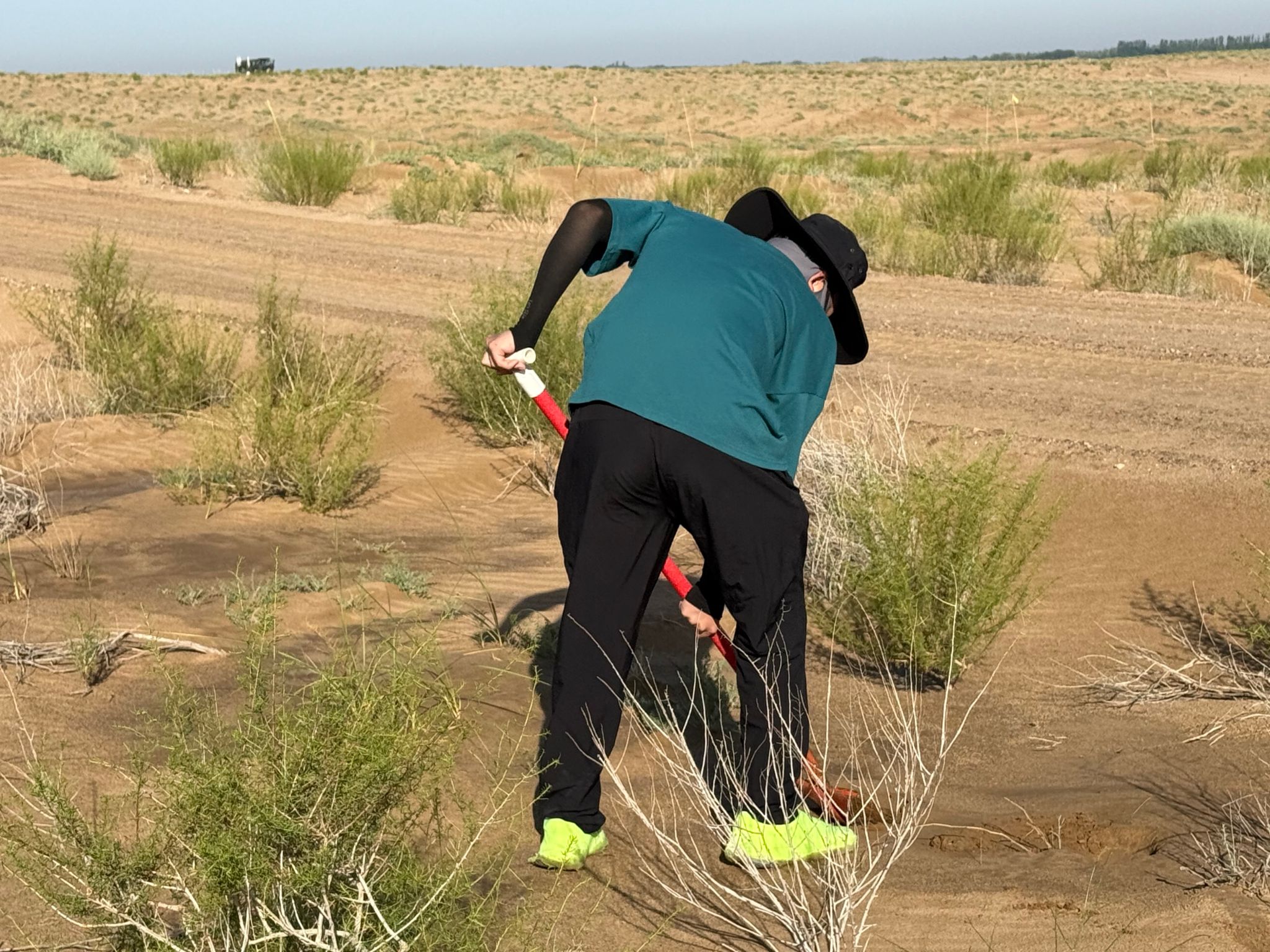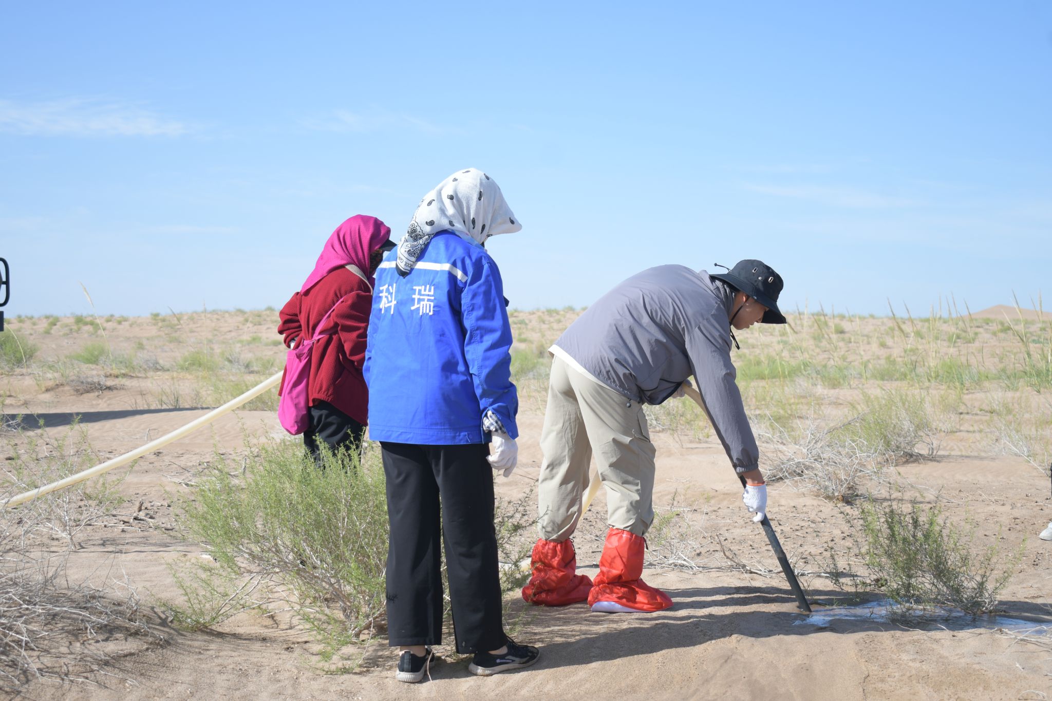 在梭梭树灌溉工作中,团队成员克服高温与高强度作业挑战,4车64m³水历经5小时完成灌溉。面对生疏的流程,队员们从搬运固定水管学起,在专业人员指导下,掌握“冲坑慢渗”诀窍,顺利完成灌溉任务,获得当地治沙人员认可。灌溉后,队员们立即投入回填坑洞、扶正树苗、疏松土壤等收尾工作。即便有队员因暴晒流鼻血,稍作处理后仍坚持工作,用行动诠释责任。