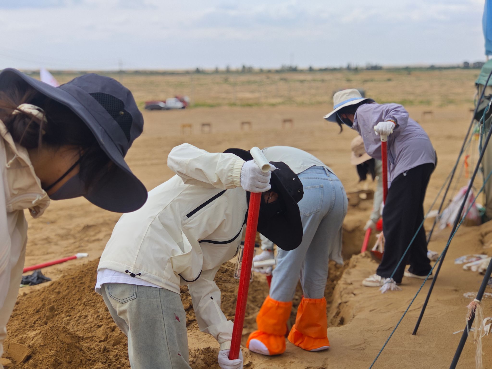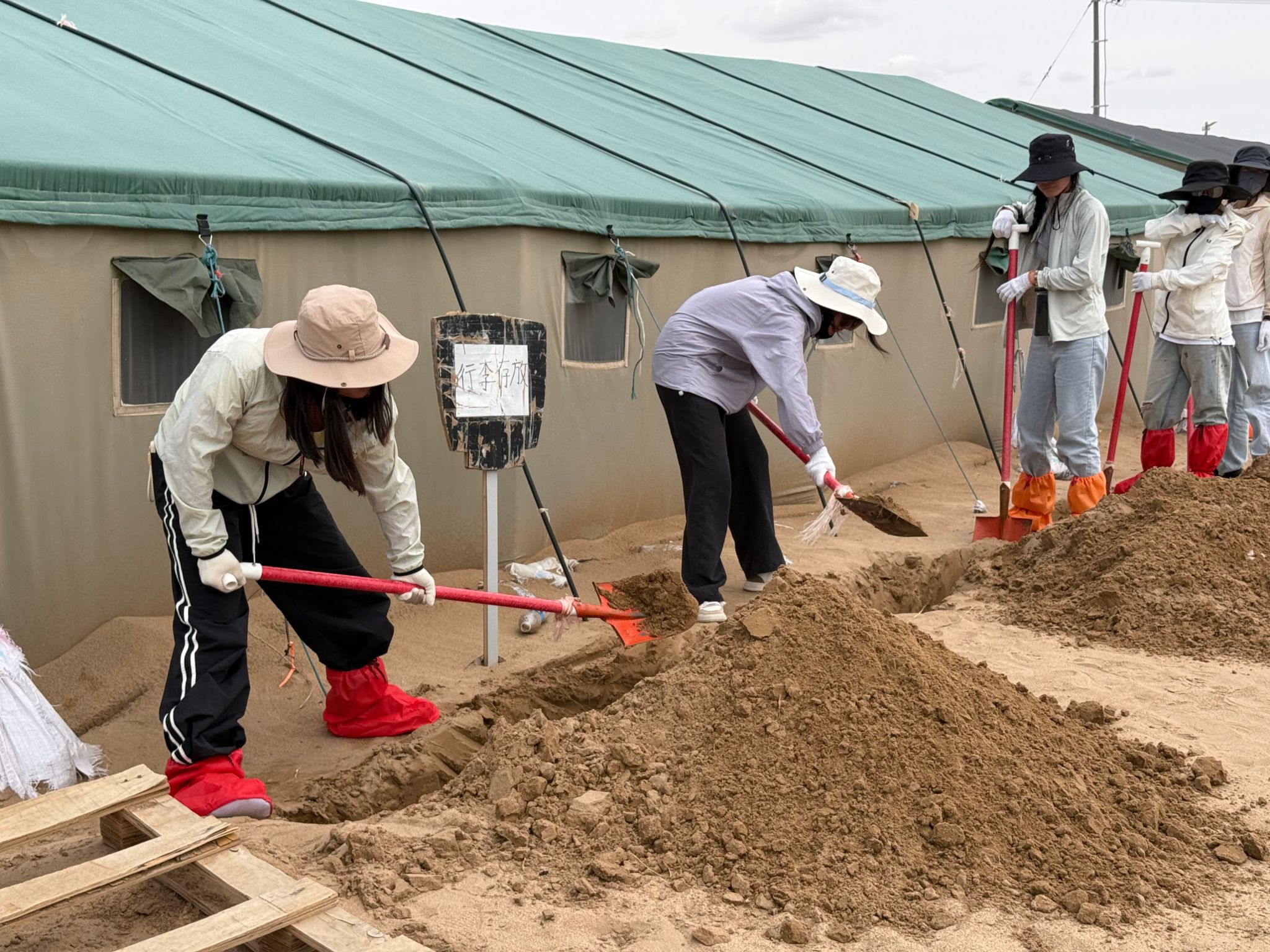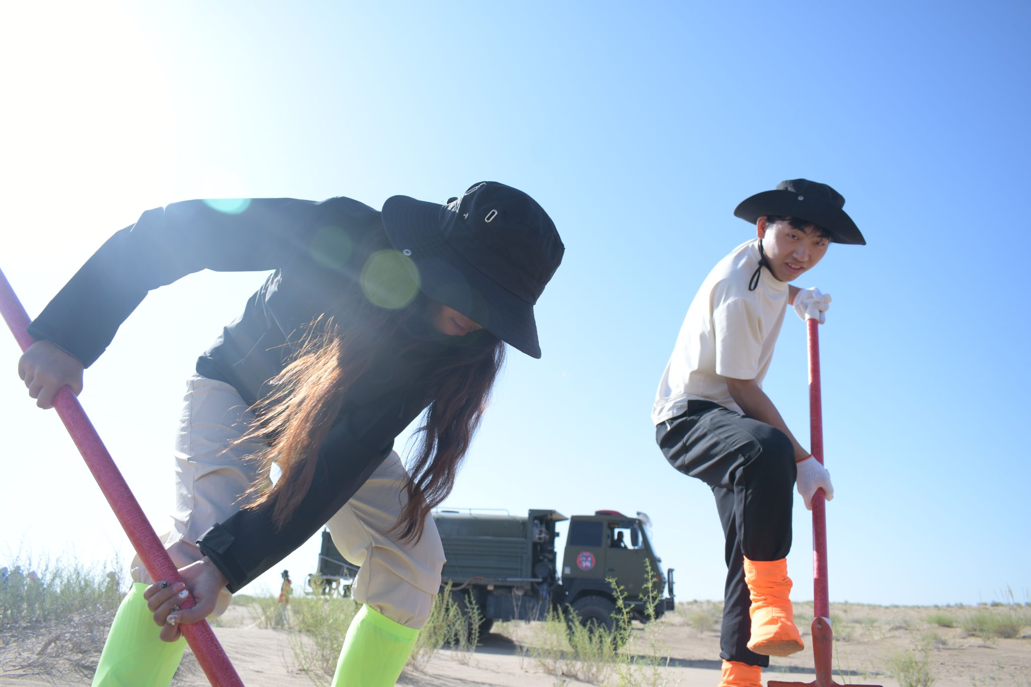 在梭梭树灌溉工作中,团队成员克服高温与高强度作业挑战,4车64m³水历经5小时完成灌溉。面对生疏的流程,队员们从搬运固定水管学起,在专业人员指导下,掌握“冲坑慢渗”诀窍,顺利完成灌溉任务,获得当地治沙人员认可。灌溉后,队员们立即投入回填坑洞、扶正树苗、疏松土壤等收尾工作。即便有队员因暴晒流鼻血,稍作处理后仍坚持工作,用行动诠释责任。