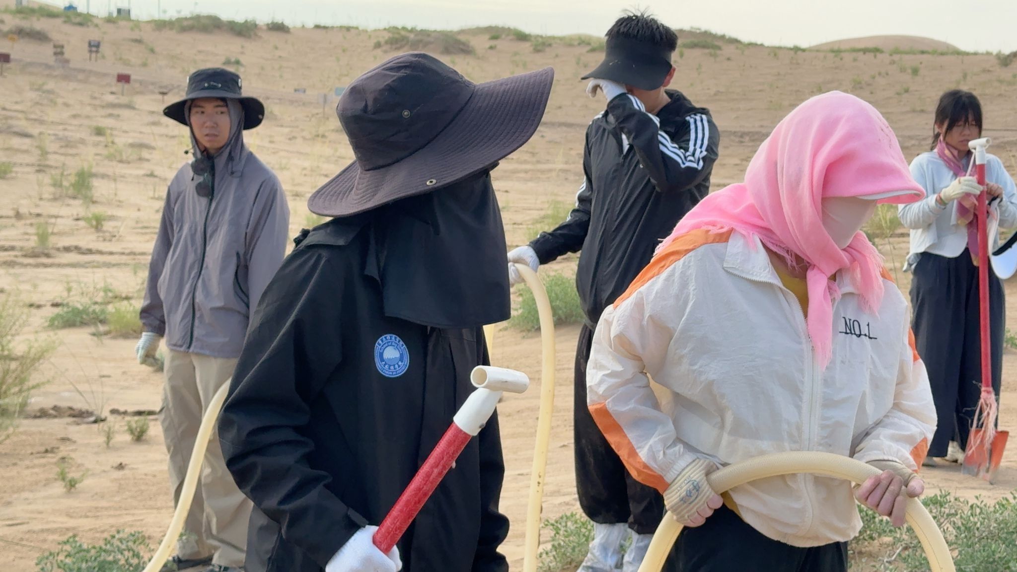 团队成员分组协作开展梭梭幼苗维护工作:一组用铁锹回填浇灌坑洞,保障树苗根系水分;另一组扛水管细致浇灌,确保水分渗透。交替作业让成员全面了解治理工作,还与其他高校分享经验、协同合作。