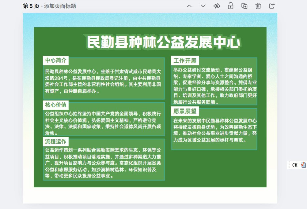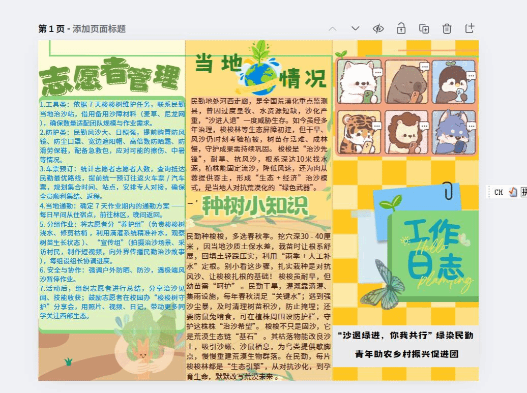 防沙治沙基地作为生态治理的前沿阵地,承载着守护家园、科普治沙的重任。此次三下乡实践活动,主动咨询基地管理员麻哥是否还有需要我们的地方,因为团队成员的积极态度,主动将“请来民勤种棵树”的植树活动和“民勤县种林公益发展中心”工作的两块展板交给团队成员创作。“以前展板设计老旧,污损也比较严重了。”基地管理员麻哥指着以前的展板介绍。团队成员发挥设计特长,将专业术语转化为生动图文。在“请来民勤种棵树”展板上,清晰展现4000亩公益林从黄沙漫卷到绿意初显的蜕变;“种林公益发展中心”板块,更了解基地,想用年轻人的语言,让治沙故事走进更多人心里。
