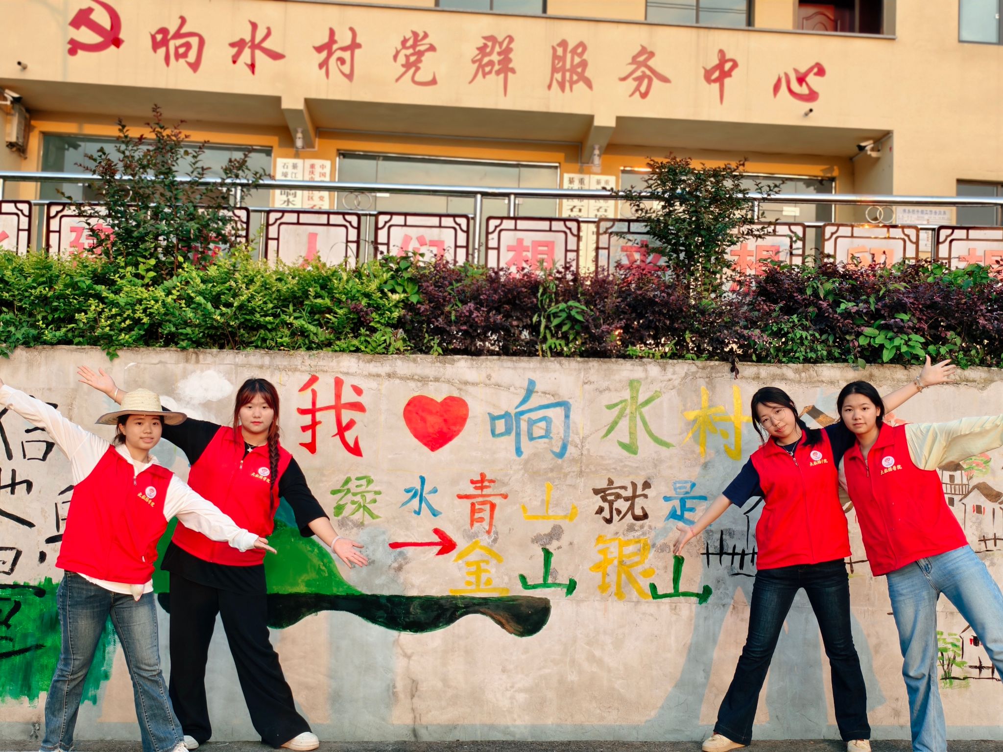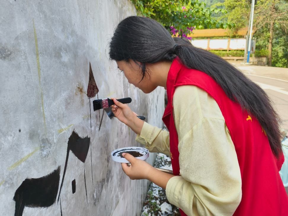 2024级数据科学与大数据技术2班的蒋雪同学作为艺术爱好者,暑期投身重庆市綦江区石壕镇响水村墙绘实践。在党群服务中心旁的墙体创作中,她以金黄稻穗呼应“相信土地的力量”,借青绿山水串联“绿水青山就是金山银山”,用错落屋舍勾勒“和谐农村 美丽家园”。创作时,她观察响水村作物形态、民居风格,让画面扎根乡土。烈日下调试颜料,风雨中勾勒线条,村民的支持温暖相伴。这段经历让蒋雪同学深刻体会:墙绘不仅是艺术创作,更是乡土情怀的传递。一支画笔串联校园所学与乡村烟火,在山野墙垣间,她读懂土地的力量,更以青春创意为乡村振兴添抹亮色。