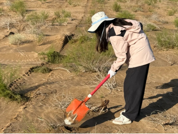 2024级数字媒体技术10班彭初华同学,跨越1400多公里从重庆到甘肃民勤实践。她日复一日维护梭梭苗,浇水、回填的动作成了肌肉记忆,期间探访当地、聆听治沙故事,在暴风雨中体会治沙意义。直播助农让她收获成就感,重庆人的热情让她交到特别的朋友,参与捡垃圾、绘画等工作。她深刻理解“西北并非寸草不生”,触摸到这片土地的生态韧性与生命温度,用行动践行青春担当。