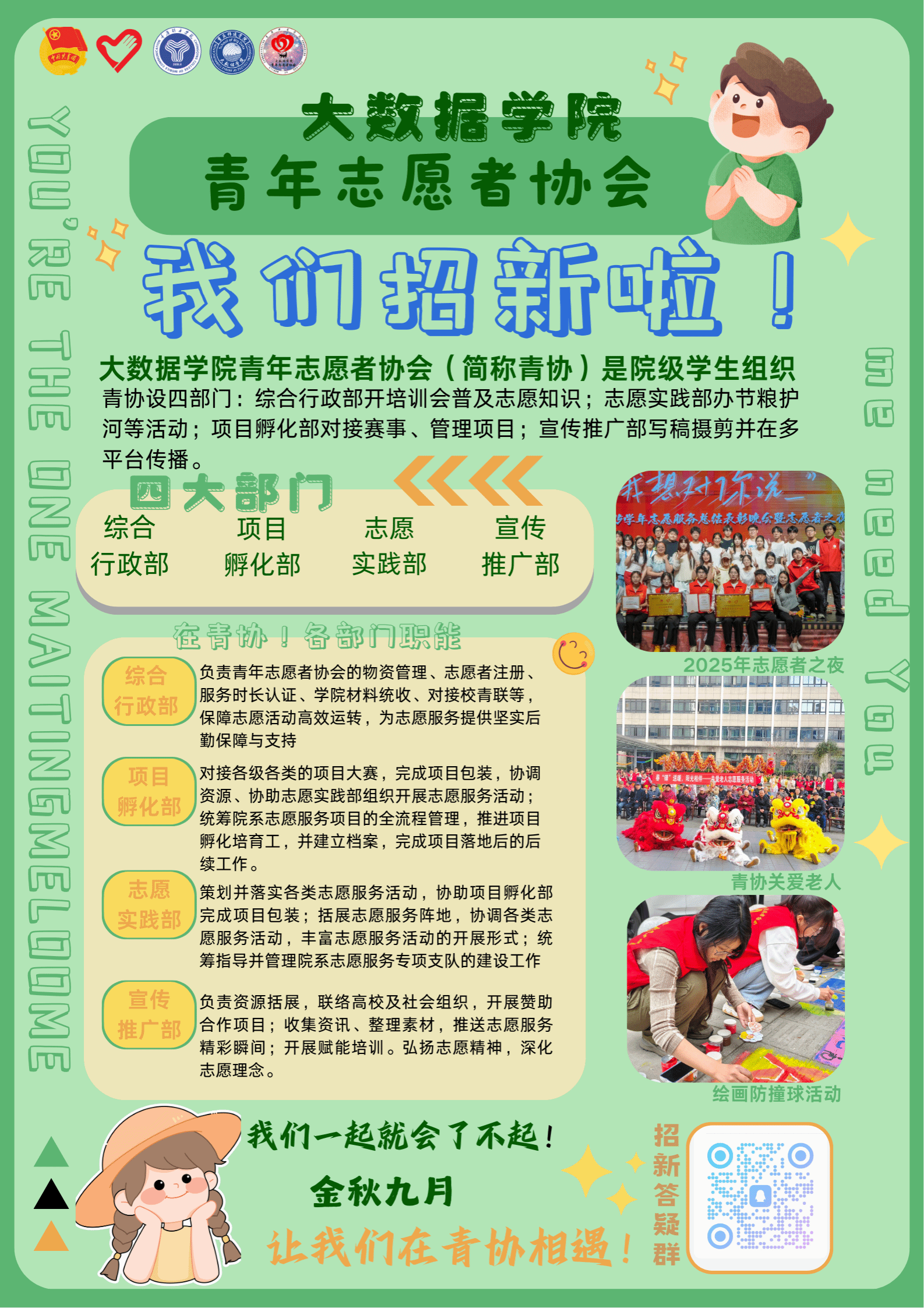 此次干事招新,不仅为大数据学院青年志愿者协会补充了新鲜血液,更搭建起青年学子践行社会责任的平台。未来,大数据学院青年志愿者协会将以新干事加入为契机,持续开展多样化志愿服务活动,引导更多青年在奉献中成长、在实践中进步,让志愿精神在校园中绽放更耀眼的光芒。