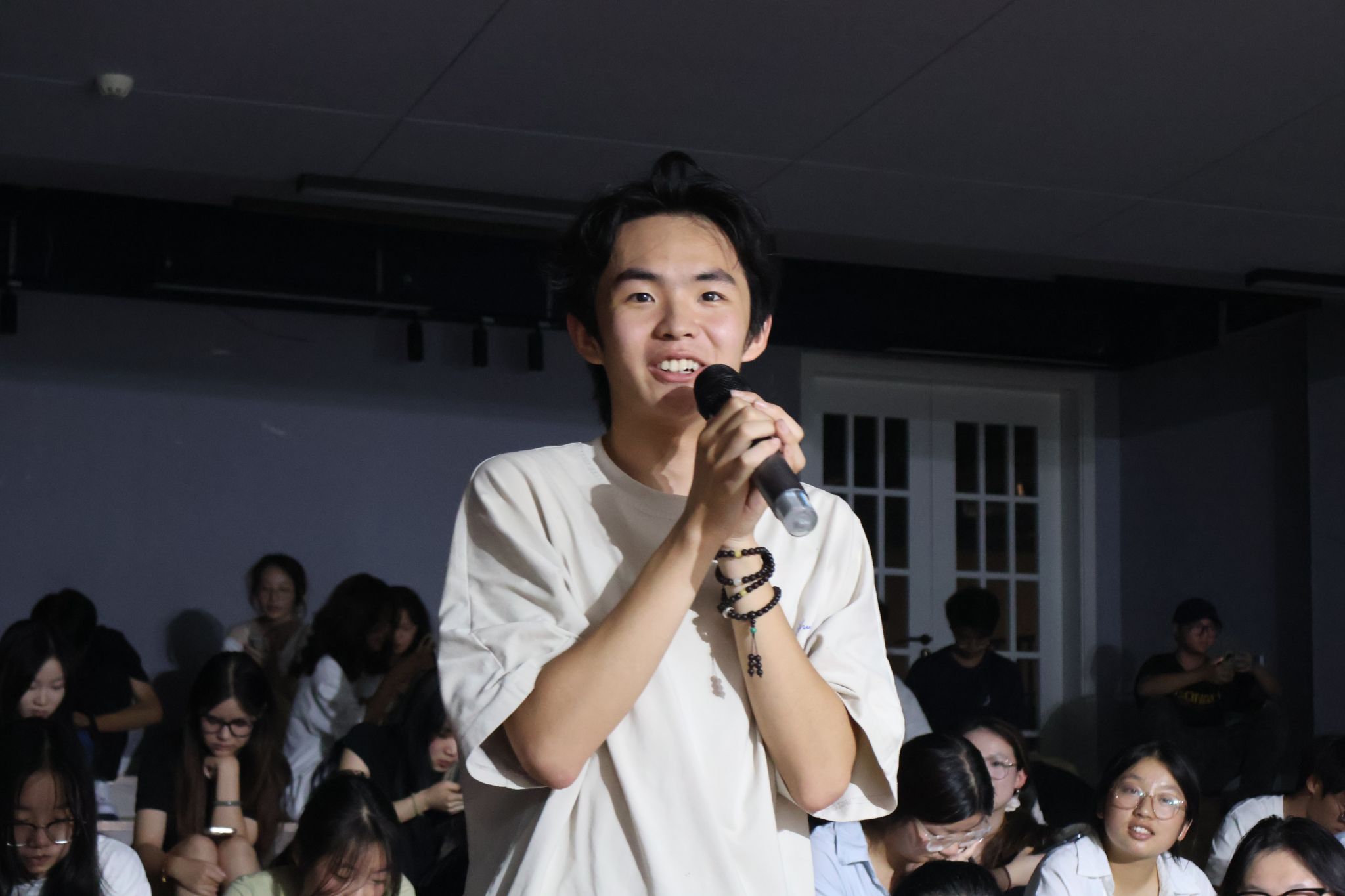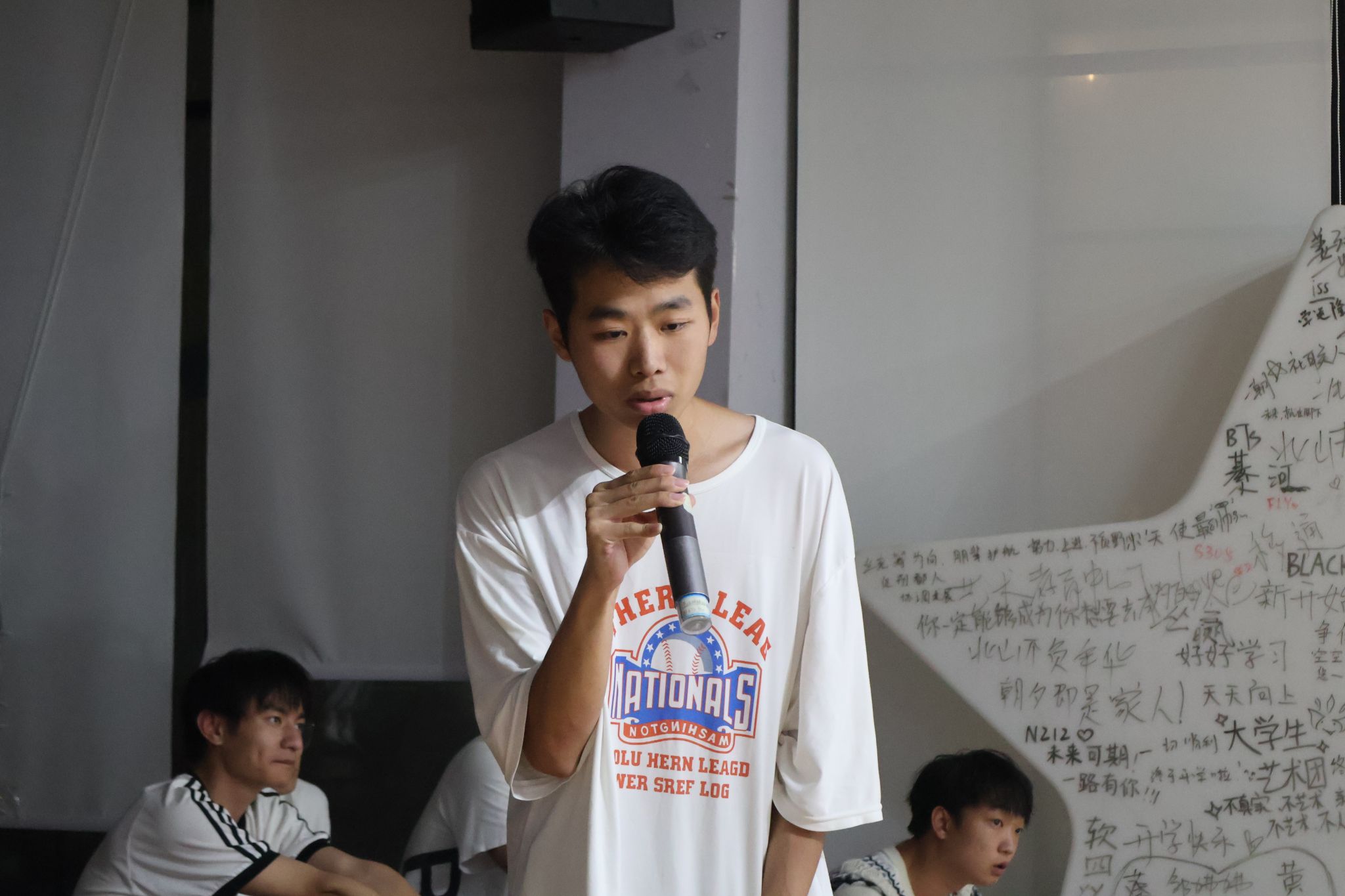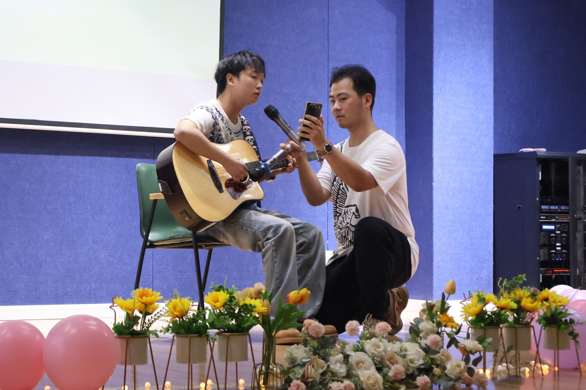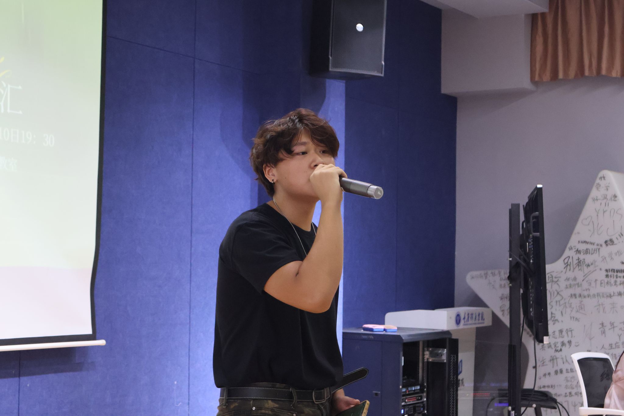 活动当晚,苍山阶梯教室内暖意融融,柔和的灯光与民谣的静谧气质相得益彰,为这场充满情怀的音乐盛会奠定了温馨的基调。在表演环节,八位同学依次登台献唱。演唱者们用真挚的情感、动人的嗓音,将一首首民谣演绎得淋漓尽致。