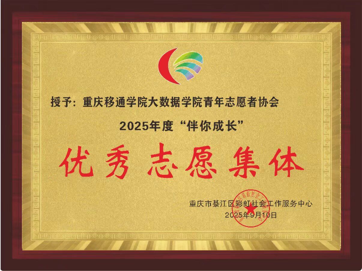 重庆移通学院大数据学院青年志愿者协会“青携彩虹,公益课堂”线上志愿服务项目的扎实工作和显著成效,荣获2025年度“伴你成长”优秀志愿者集体。这一荣誉不仅是对协会志愿服务工作的认可,更是校社协同育人机制成效的体现。