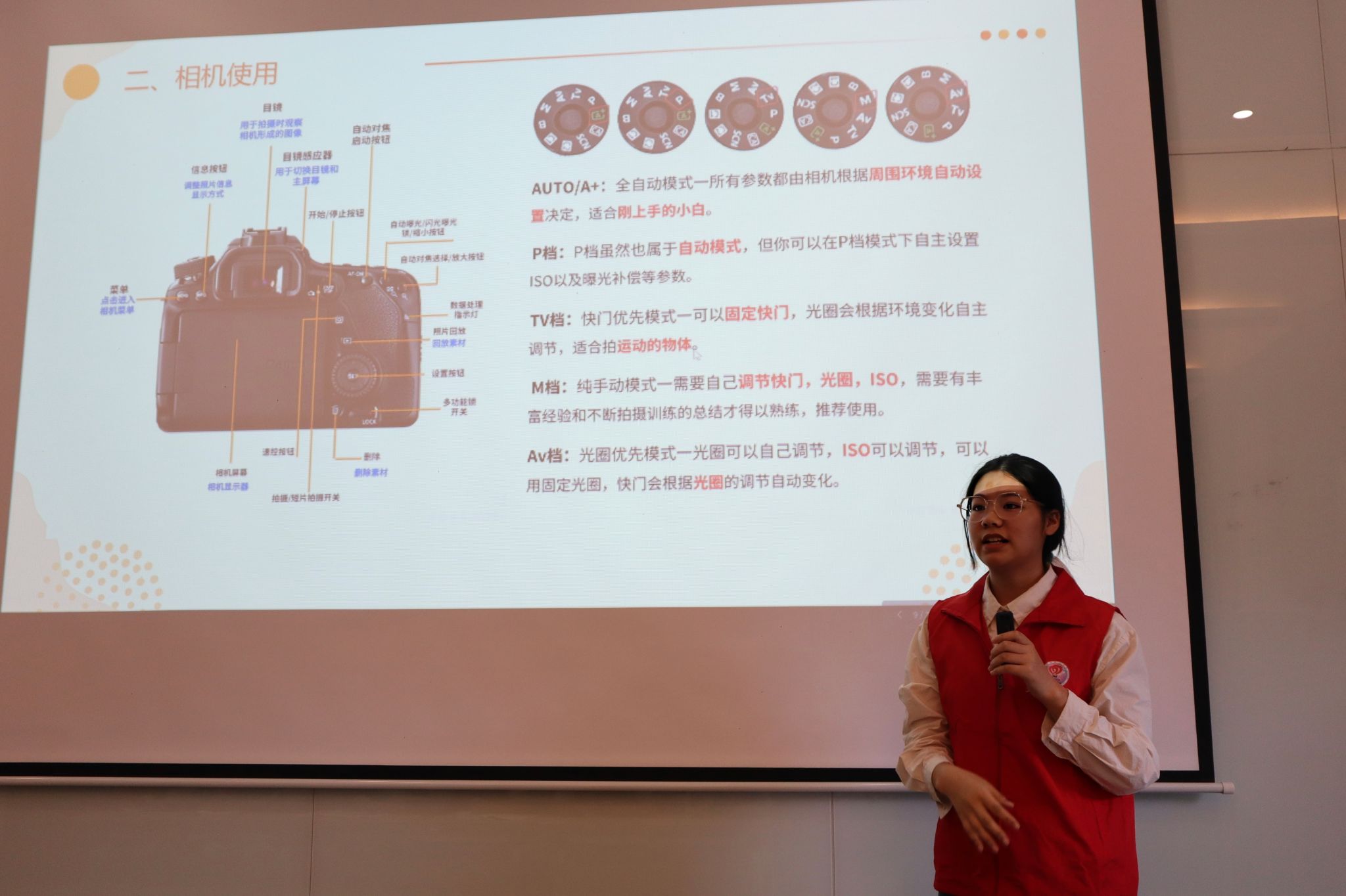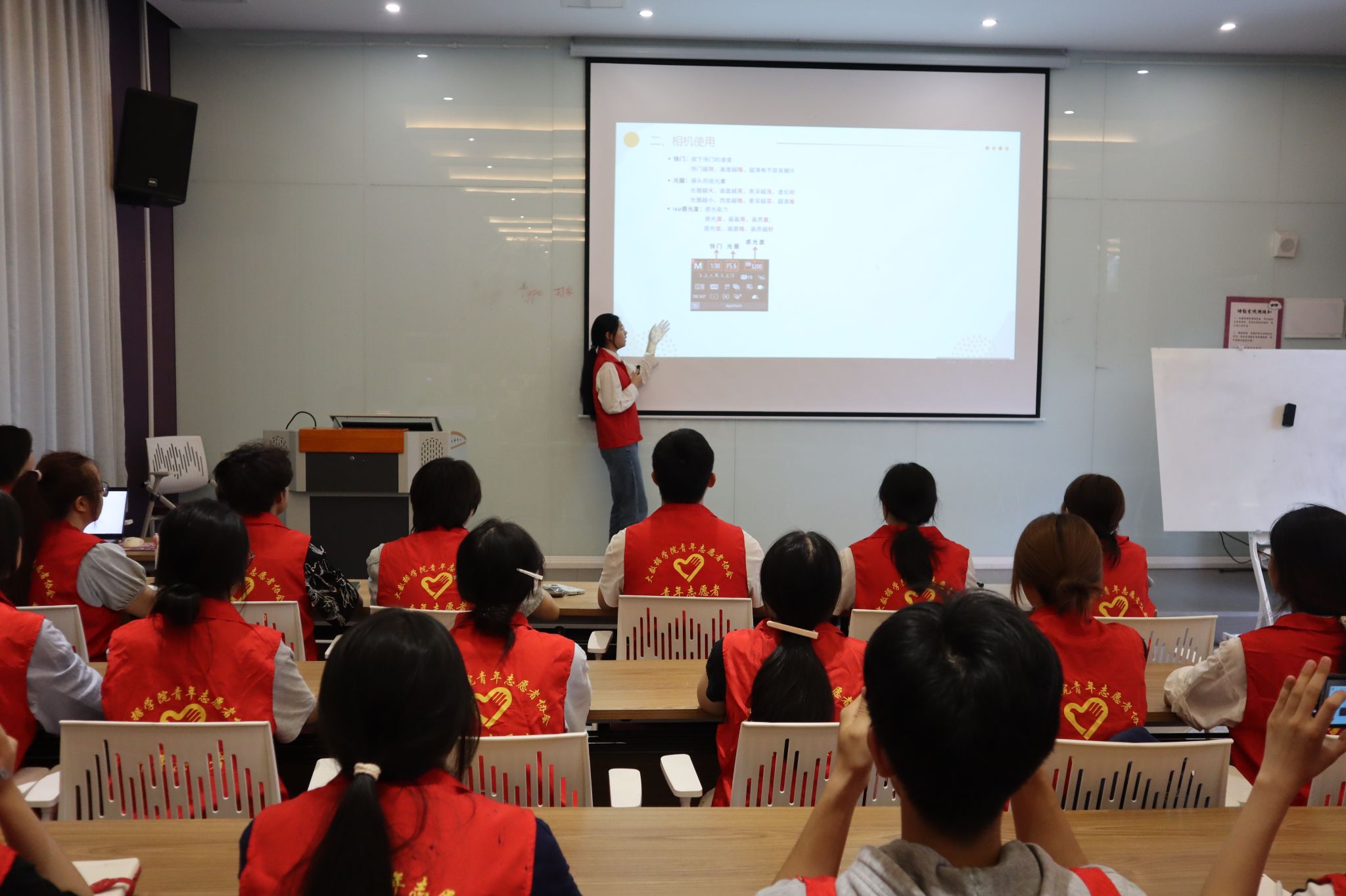 随后,主讲人聚焦相机的使用及拍摄,详细介绍了相机的使用方法,例如如何选择最佳角度进行拍摄,为他们在未来志愿服务中的摄影记录打下基础。还从排版的角度重点解析了字号、字形等细节参数对总体的影响,让他们后面能够更好的让志愿服务精神传播出去。
