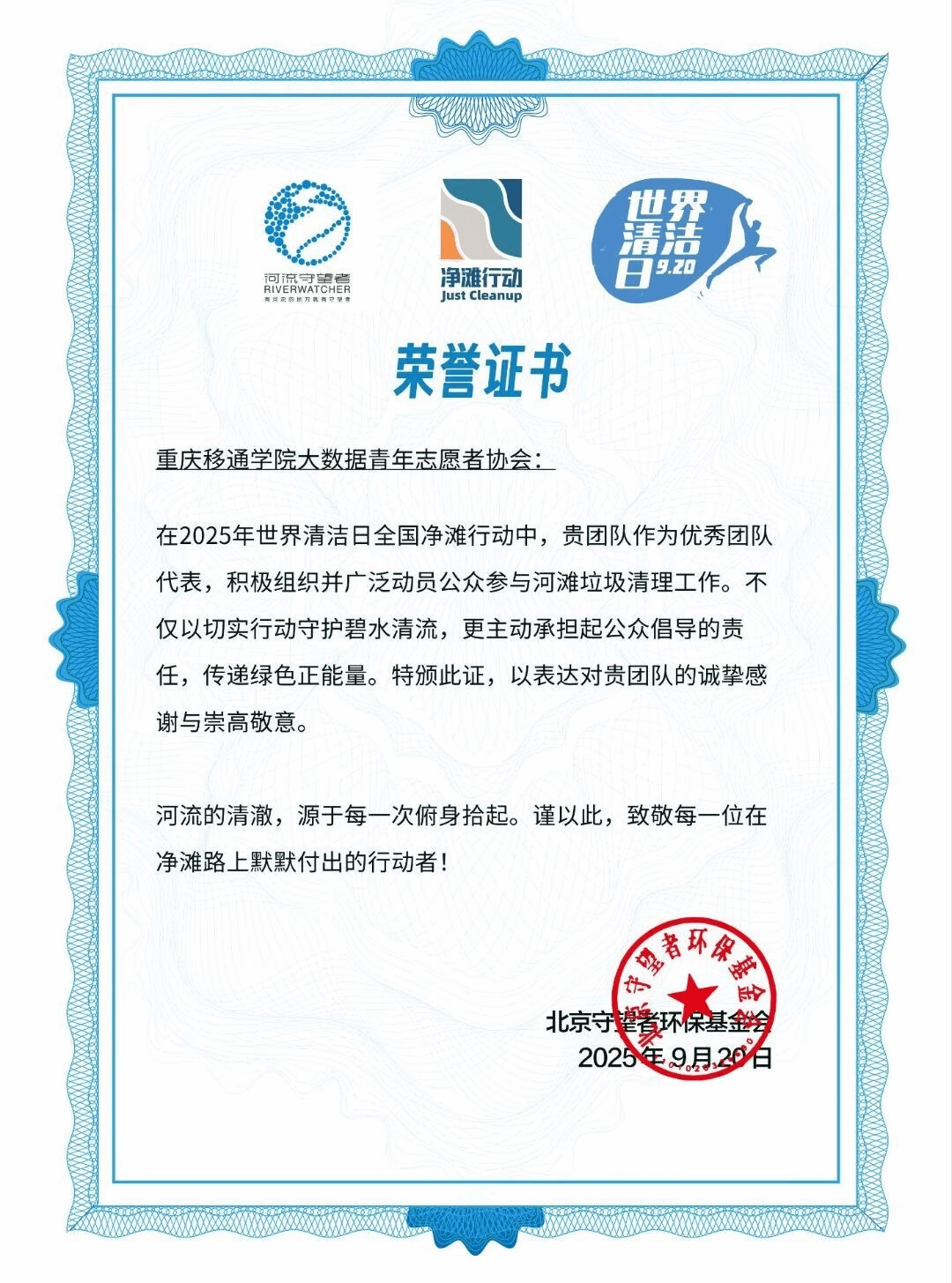 2025年9月20日“世界清洁日”之际,大数据学院青年志愿者协会凭借在净滩行动中的突出表现荣获优秀团队代表,成为重庆地区唯一获奖高校。以切实行动守护碧水清流,主动承担起公共倡导的责任。