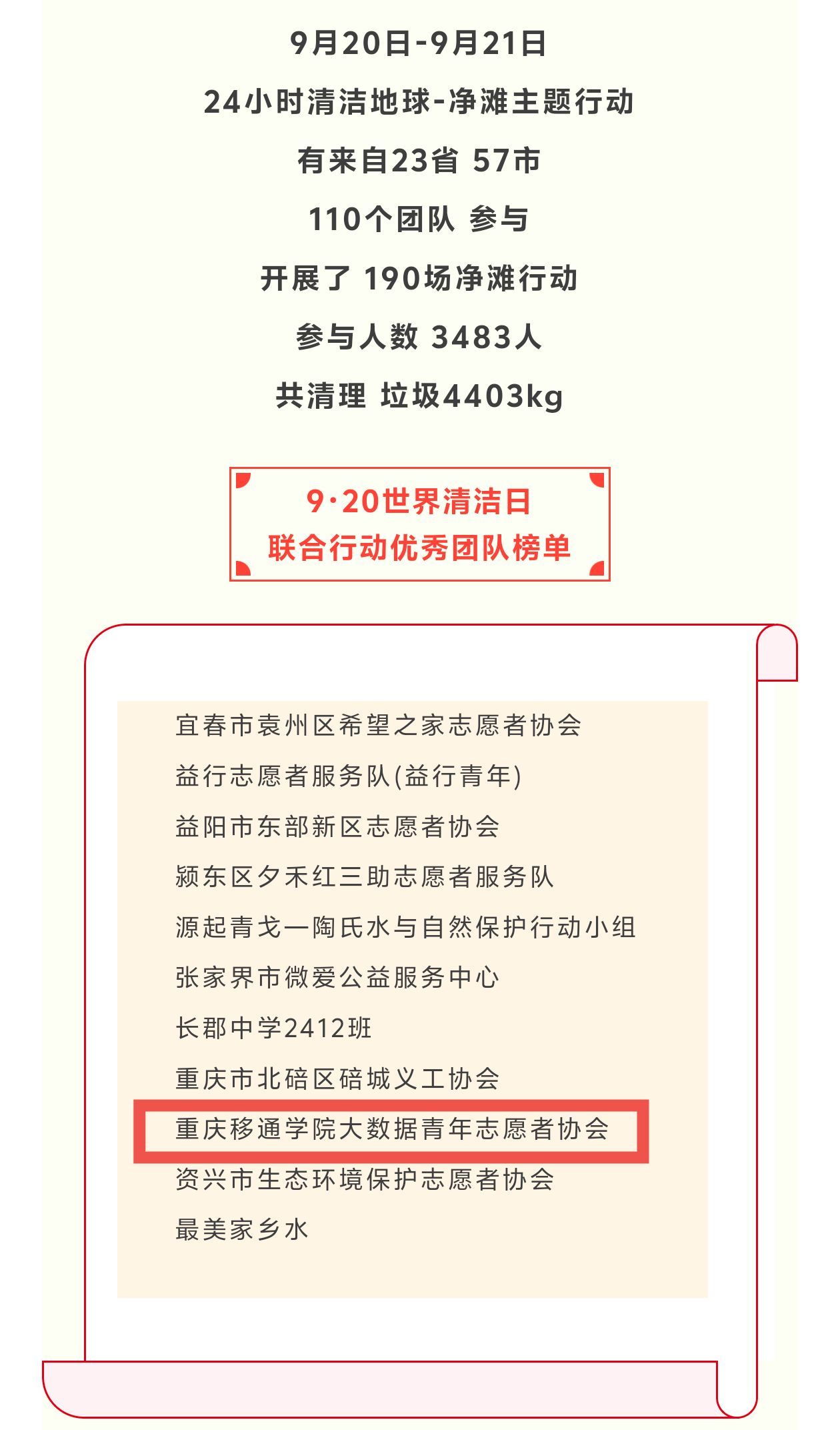 本次世界清洁日共有来自23省57市的110个团队开展了190场净滩行动,3483人参与其中,共清理垃圾4403kg,大数据青协作为重庆地区高校团队代表获此荣誉,彰显了青年志愿者的环保行动力。