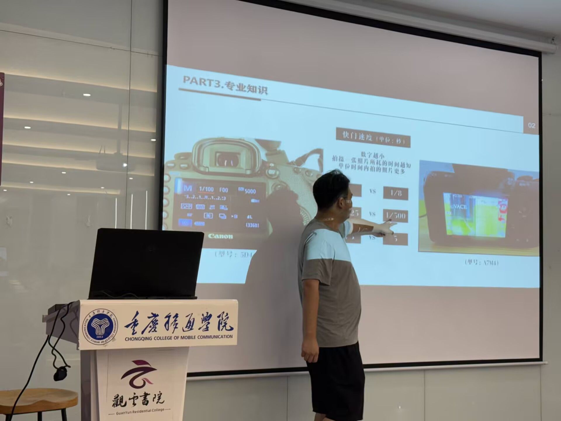 品牌中心与新闻中心主席蹇逍受邀请担任本次培训主讲人。在讲解拍摄技巧时,他以图片为例,展示了恰当的曝光所带来的最佳视觉体验。结合不同场景,强调捕捉互动细节与情感瞬间的重要性。并介绍了远景、中景、近景、特写四种景别的适用场景,帮助成员通过景别搭配丰富素材层次。