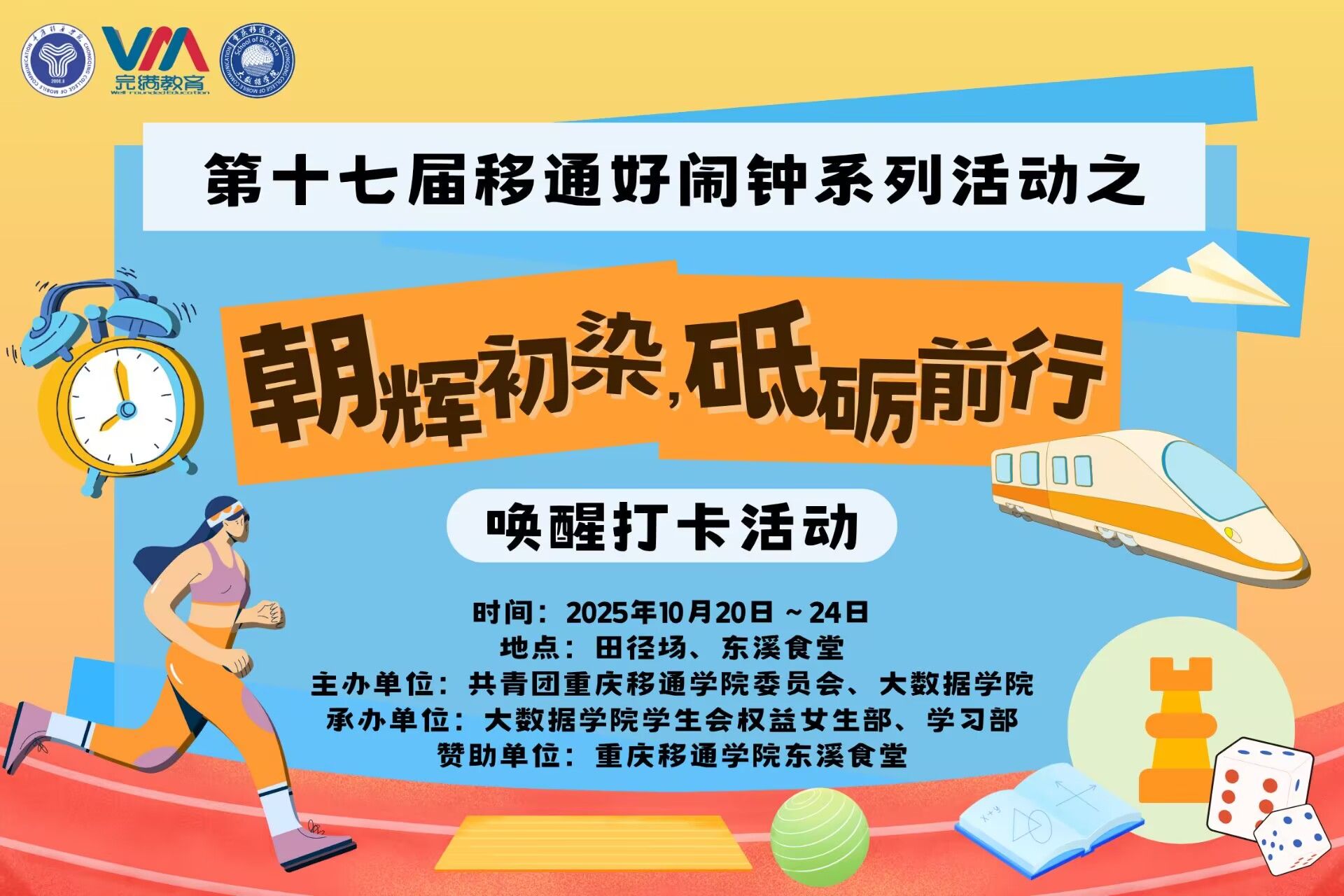 同学们注意啦!为帮助大家告别拖延,培养规律作息,由大数据学院主办的第十七届移通好闹钟系列活动之“朝辉初染,砥砺前行”唤醒打卡活动,将于10月20日正式启动,活动为期5天,地点设在田径场、东溪食堂,期待你的加入!