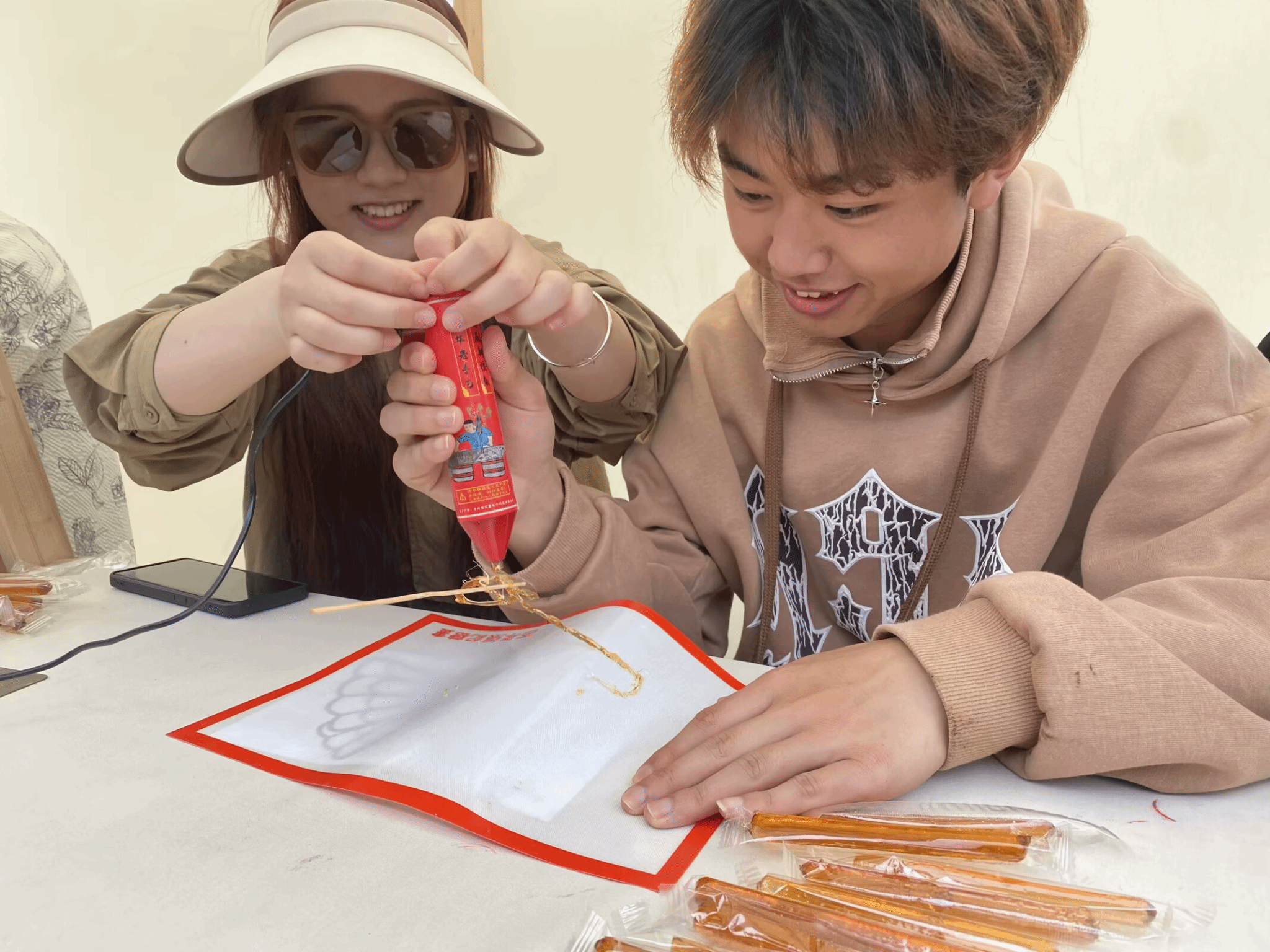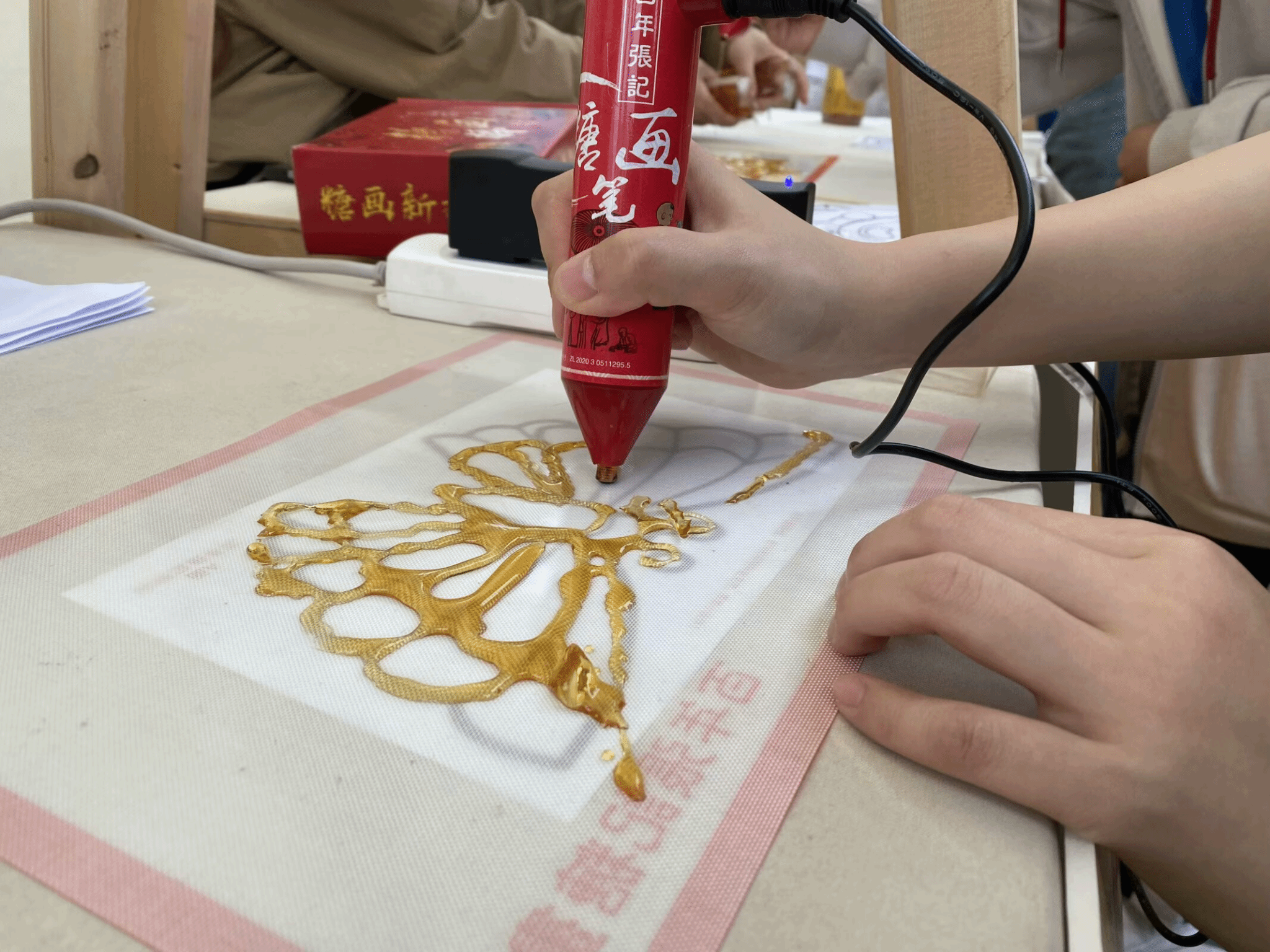 在温老师的示范指导下,学生们纷纷拿起糖勺,尝试在糖板上勾勒出各种图案。从简单的花朵、小动物,到复杂的龙凤、字体,大家专注而投入,现场气氛轻松热烈。温老师不时走到学生身边,细致指导手法,鼓励大家发挥想象力,勇于尝试。蒲林儿兴奋地说:“第一次亲手做糖画,既紧张又兴奋。看着糖液在手中慢慢成型,特别有成就感!”另一位同学则感慨:“原来传统文化也可以这么有趣,这样的活动让我对非遗有了更深的理解和感情。”