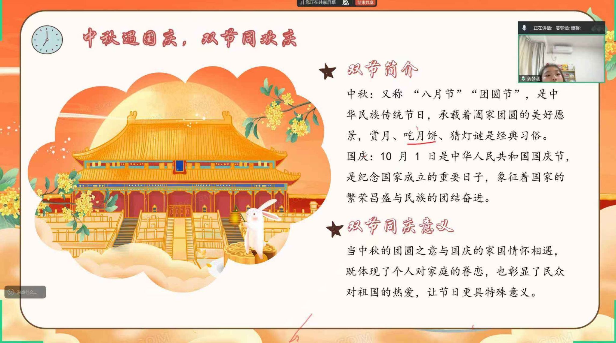 为庆贺双节,志愿者以多元课堂的形式为綦江区中小学生传授传统文化知识。志愿者利用课间十分钟为小朋友们讲解国庆和中秋的起源、发展、传统风俗习惯以及介绍各种庆贺节日的方式。小朋友们也与志愿者分享自己双节假日的所见所感。活动让小朋友们感受祖国强盛的同时,也种下了“自强不息,强国有我”的种子。