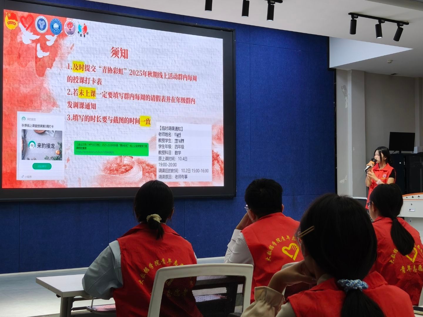 为进一步提高志愿服务质量,解决服务中反映的相关问题,规范志愿者活动参与及材料提交流程。2025年10月17日,重庆移通学院大数据学院与爱“童”行志愿服务专项支队组织开展“青携彩虹,伴你成长”2025-2026学年秋季线上公益辅导课堂第二次线下培训会,以精细化培训的方式,提升志愿者的志愿服务能力,推动志愿服务工作朝着更高效、更规范的方向稳步前行。