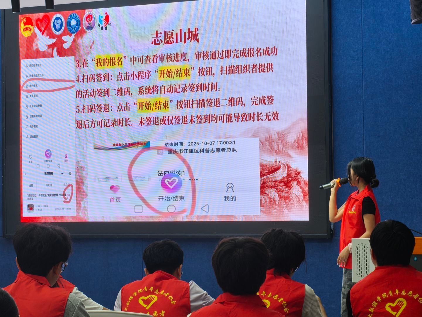 为使志愿者熟练掌握活动参与全流程,主讲人对“志愿山城”平台操作进行细致拆解。从服务时长录入的要求,到公益活动报名的步骤,再到扫码签退的操作细节,均以图片形式进行完整过程的呈现。同时,主讲人现场引导志愿者登录“志愿山城”小程序,查看活动组织,帮助志愿者明确公益活动的参与路径。