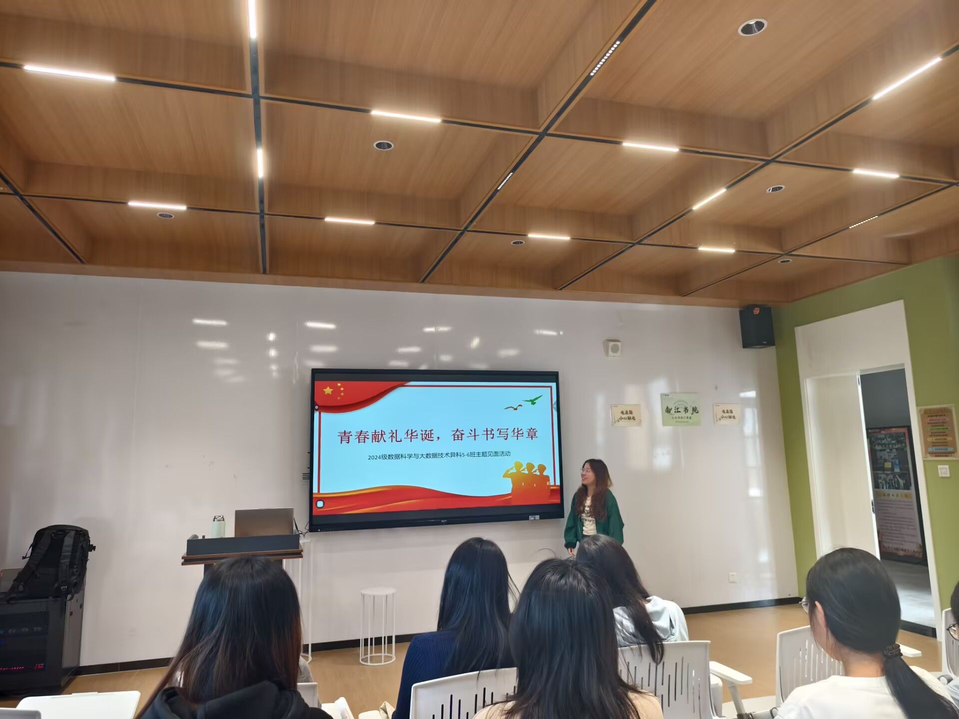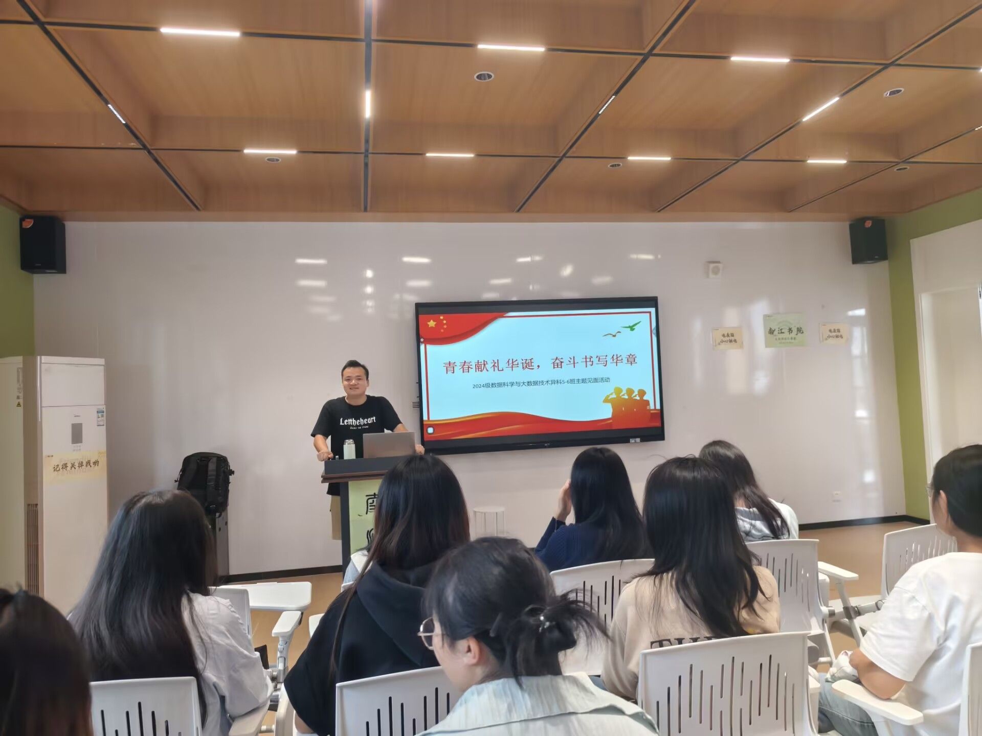 2025年10月20日中午,为庆祝新中国七十六周年华诞,弘扬爱国奋斗精神,2024级大数据学院数据科学与大数据技术异科5-6班的师生在南江书院博学悦享互动空间举办了“青春献礼华诞,奋斗书写华章”主题活动班会。本次活动旨在通过跨学科、互动式的交流,引导青年学子将个人理想与国家发展紧密相连,坚定为国奋斗的理想信念。