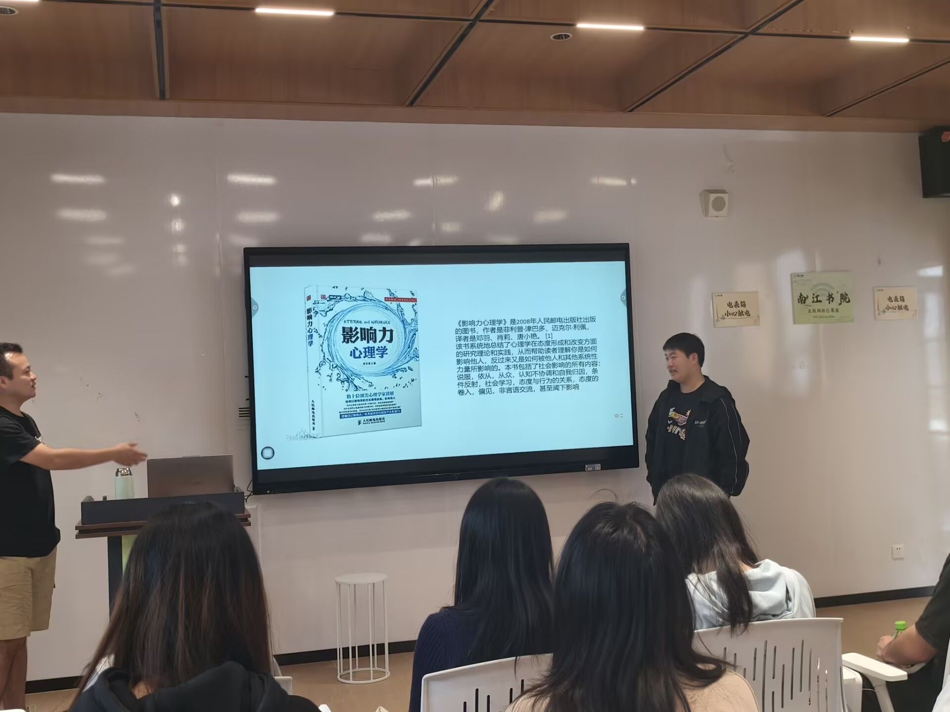 2025年10月15日日中午,2024级大数据学院数据科学与大数据技术异科5-6班的同学们在异科老师陈安鹏的带领下在南江书院博学·悦享互动空间开展本月的大咖阅读活动。本期交流的主题是《影响力心理学》大咖阅读分享会。