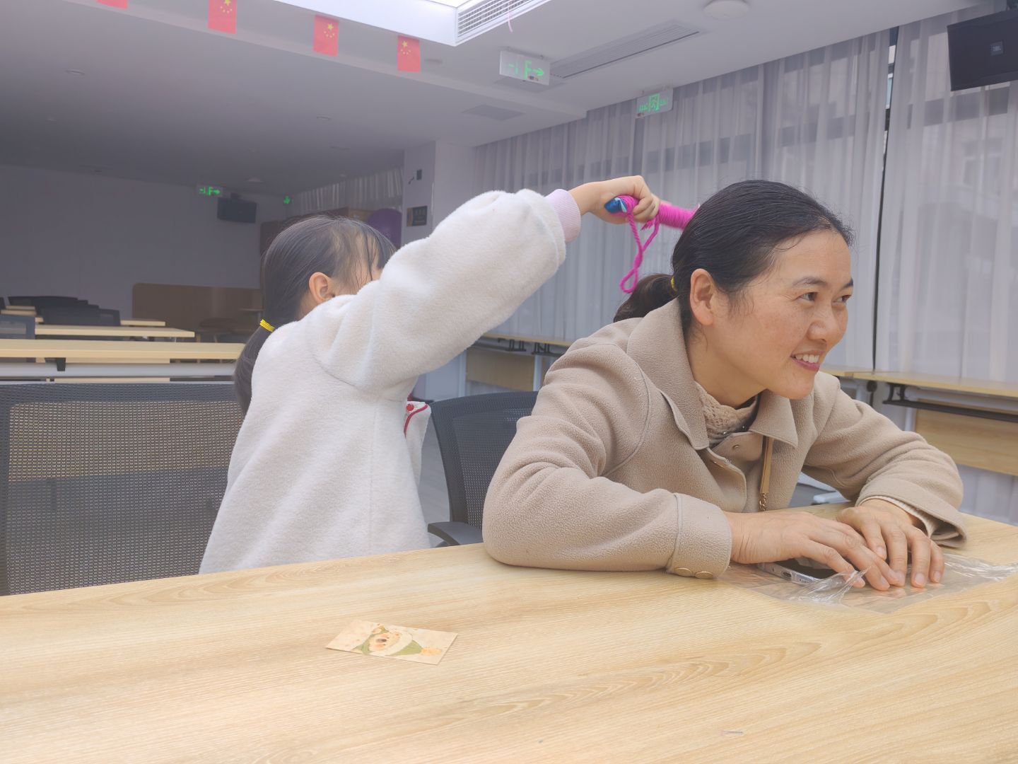 进入手工环节,小朋友在志愿者和家长的指导下,将艾叶细细填充进纱布中,用手将艾草压实压圆,接着将木棒插入艾草团中间,然后再用一块图案丰富的布将整个团和木棒包裹起来,最后用棉绳缠绕固定。尽管他们的小手略显生疏,但那份专注的神情却格外动人。活动接近尾声,小朋友高高举起自己做的艾草锤上台分享展示,分享结束后,小朋友们用亲手制作的艾草锤为陪伴在一旁的家长捶背。镜头定格间,每一位小朋友笑容满面,童真尽显。