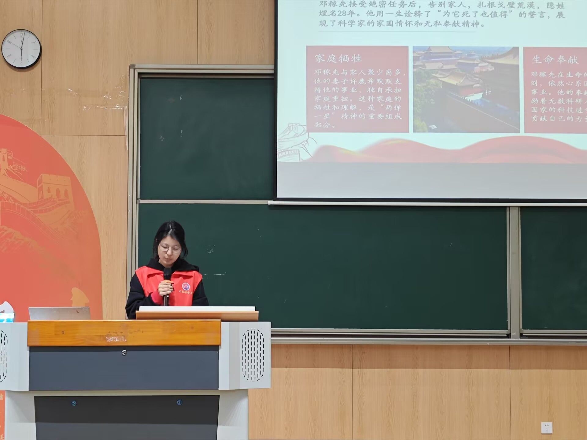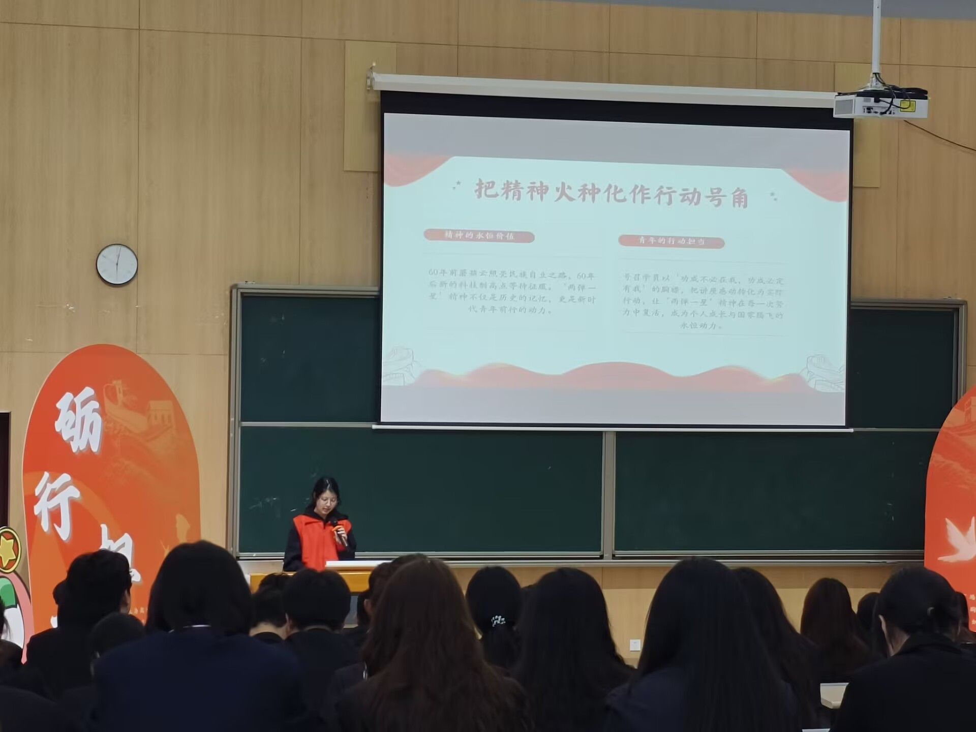 本次宣讲以“宣讲传承‘两弹魂’,青年奋进强国路”为核心方向,紧扣“两弹一星精神与青年强国担当”。活动通过讲述“两弹一星”精神的四个里程碑,钱学森与邓稼先的故事,及播放《那个瞬间的年代》纪录片的片段,引导学员去回望戈壁深处的科研岁月,探寻“两弹一星”从零到一的突破历程。