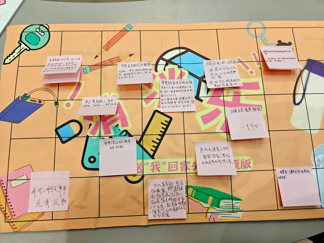在“坚守”环节中,参与者写下对物品失而复得的期待,在围圈分享中,同学们讲述了成长旧物、亲情信物背后的故事。一声声“我懂你”的回应与轻柔掌声,让原本陌生的彼此因共同珍视而会心微笑;在“留舍卡片”环节,同学们写下对自己珍贵物品的寄语,并与志愿者合影留念;粉色贴纸贴满“心愿墙”,承载着大家对失物回家的祝福与服务优化的建议。一对一咨询中大家进一步了解失物登记技巧与社群加入方式,建立了紧密的联系。