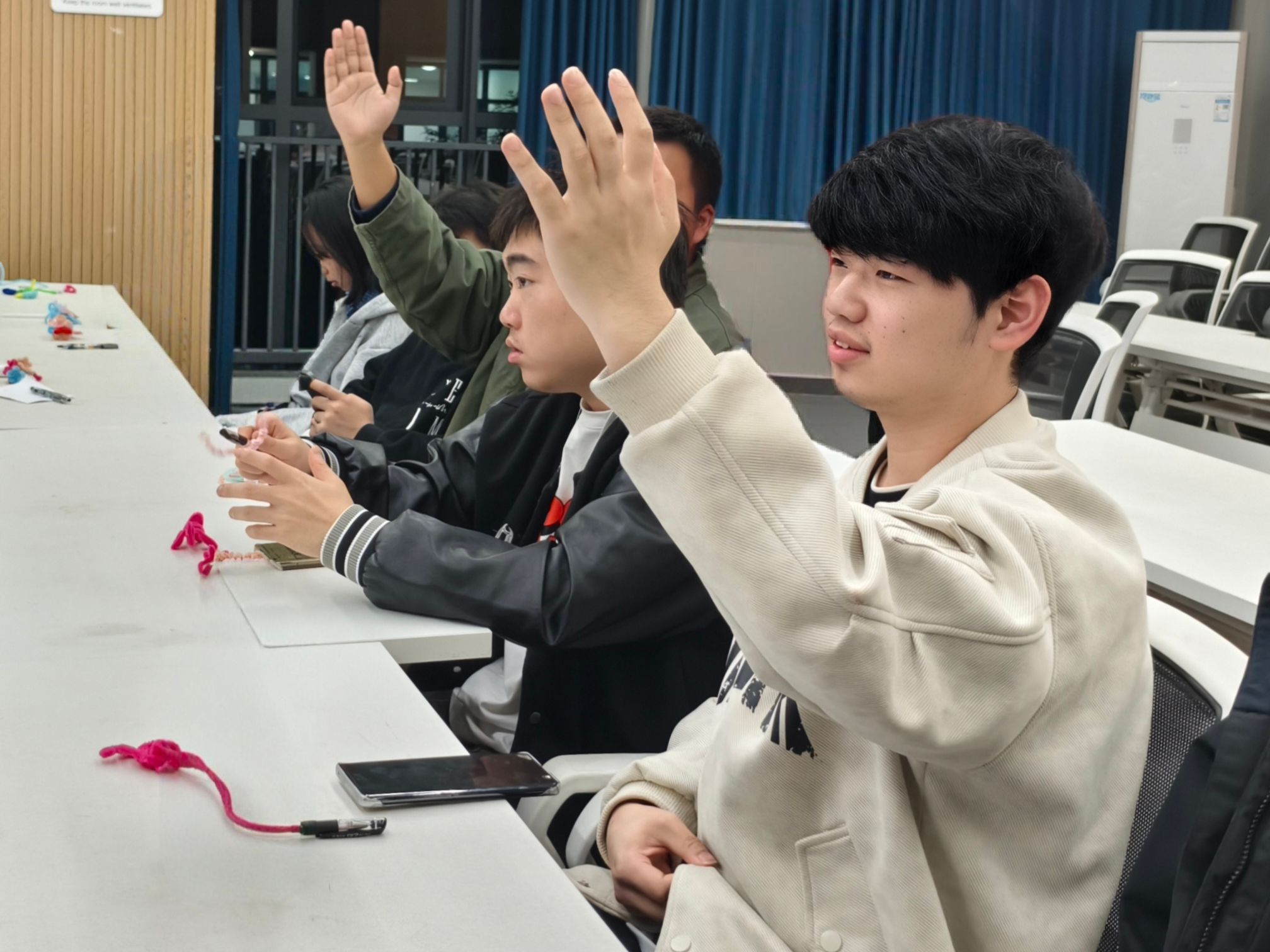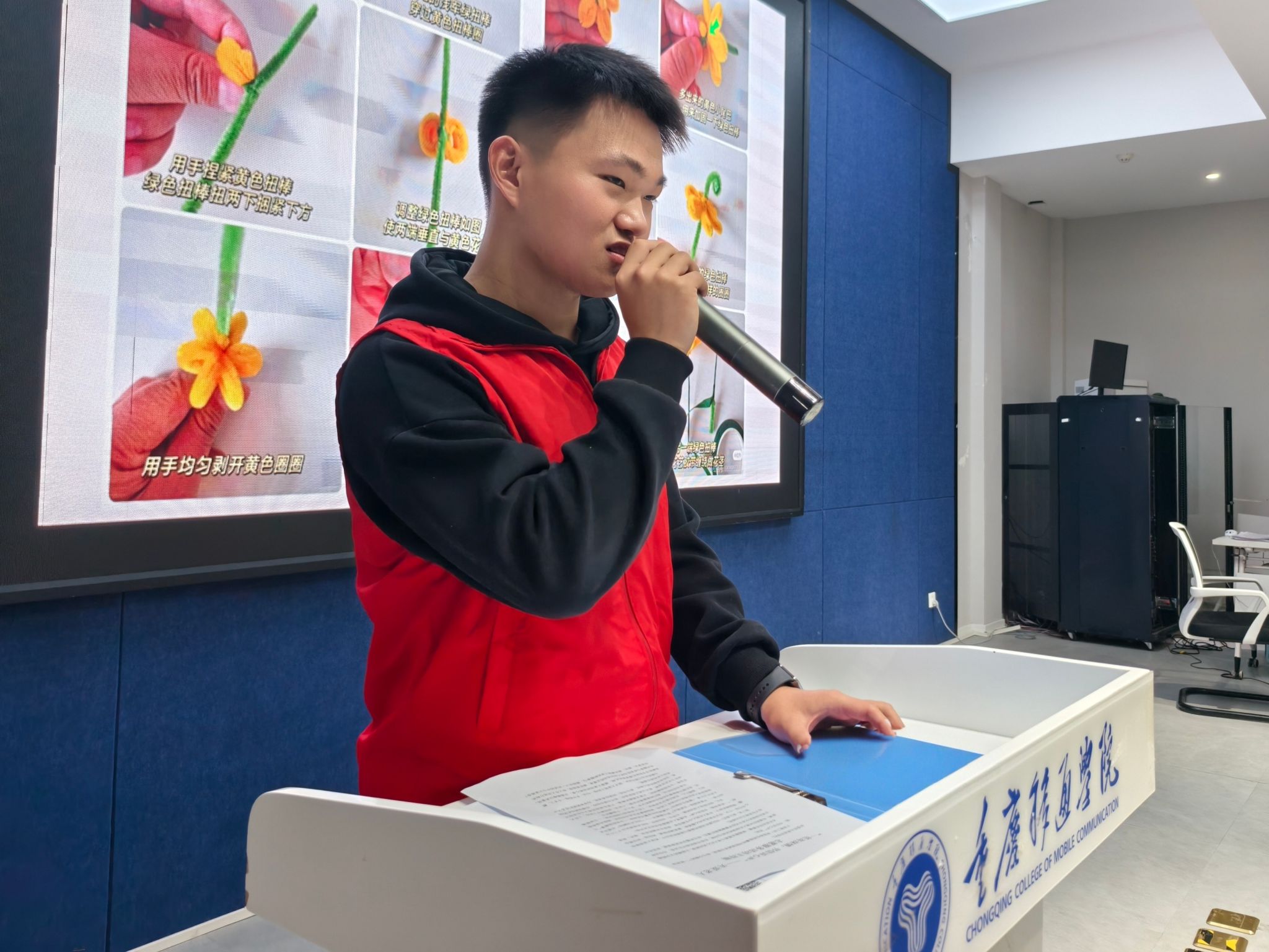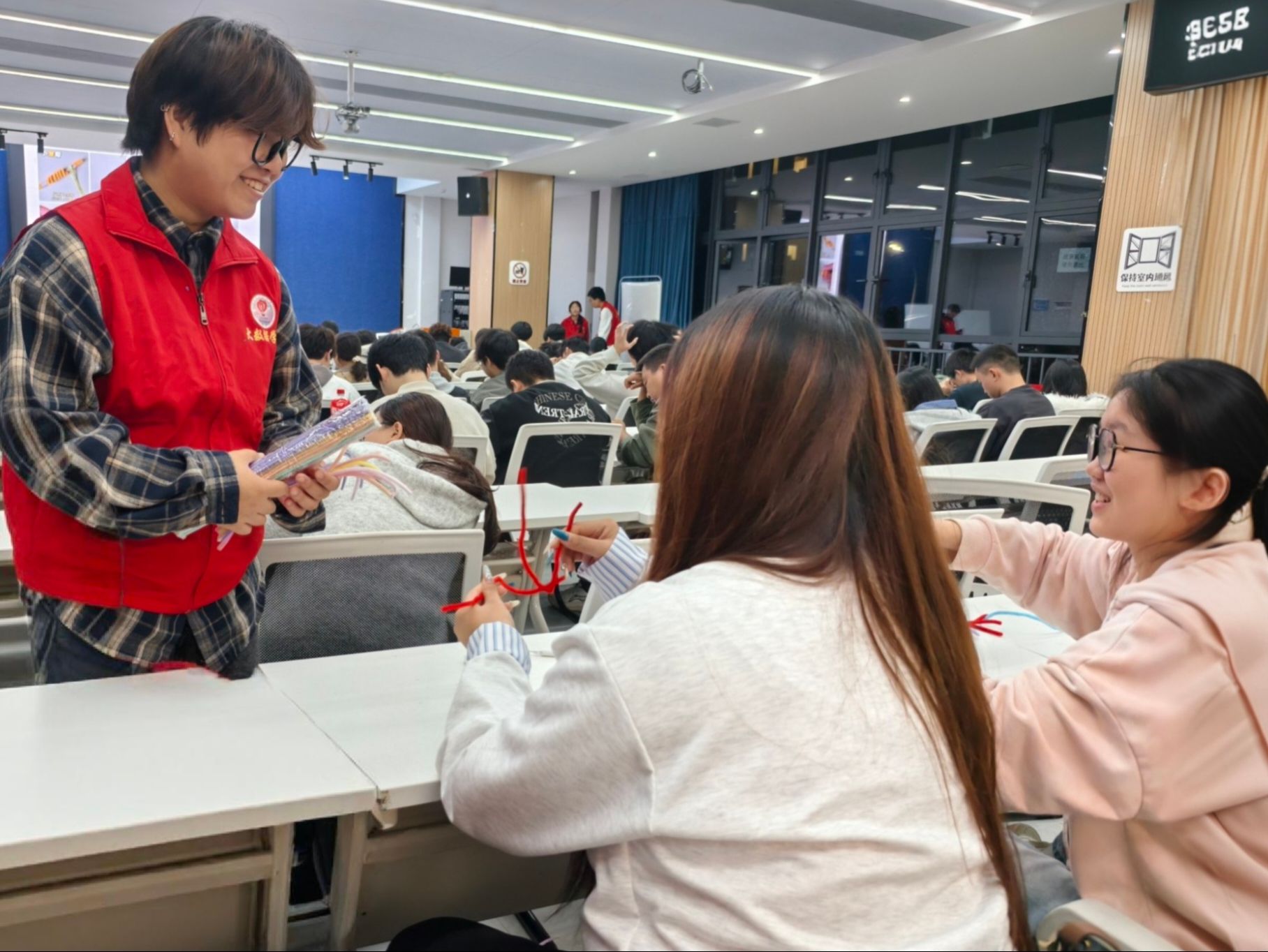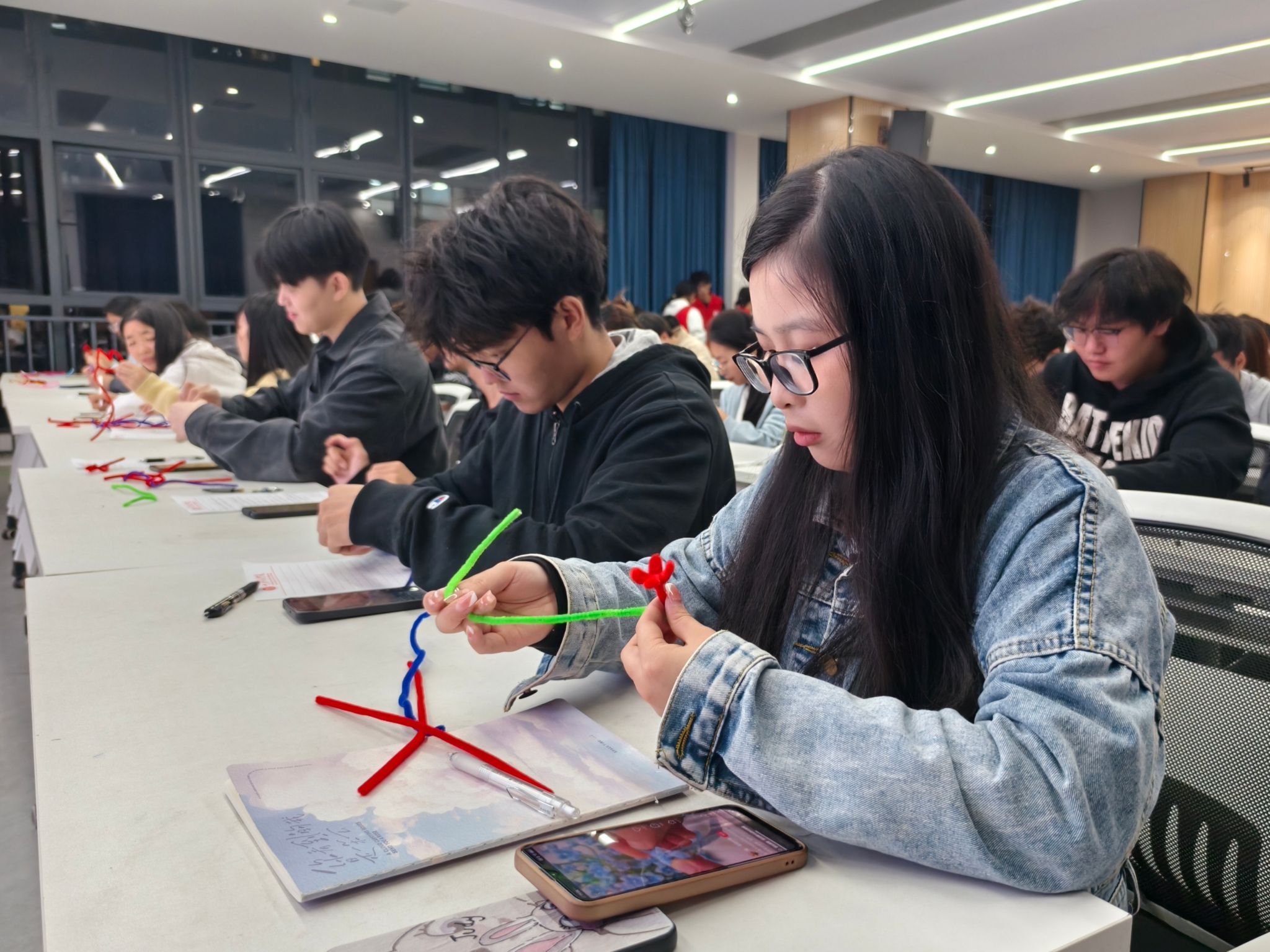 书信环节的余温还未散去,现场便迎来了更加热闹的扭扭棒手工制作环节。随着大屏幕上播放出清晰易懂的制作教程,五彩缤纷的扭扭棒在同学们手中迅速“活”了起来。大家一边参考教程,一边自由发挥,指尖翻飞间,一个个中国结、扭扭棒玫瑰在手中逐渐成型,创意与心意在指尖交织。每一件手作不仅是创意的成果,更承载着一份沉甸甸的青春心意,大家都期盼着将这些充满温度的礼物送到老人们手中,为他们的生活增添一抹明亮的色彩。