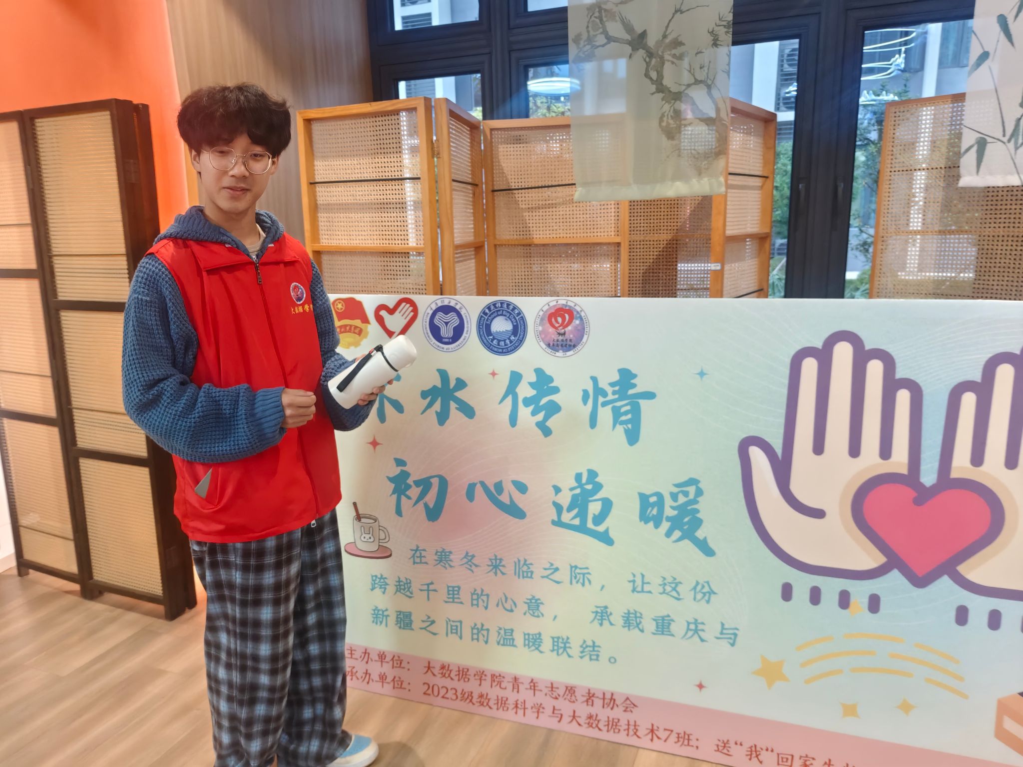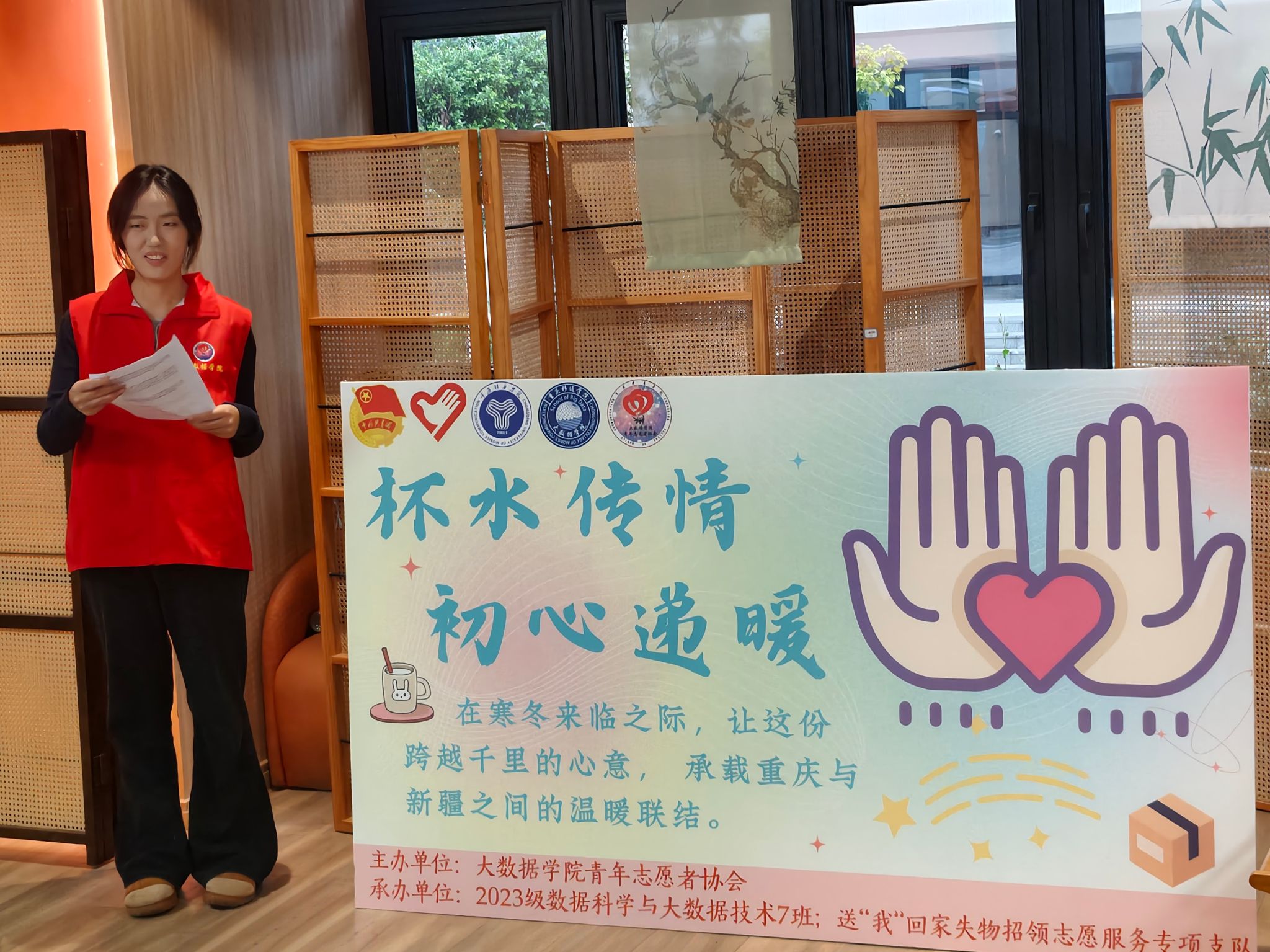 2025年11月12日,重庆移通学院大数据学院一场名为“杯水传情,初心递暖”的公益活动,将古剑书院白虹·半间闲室的温暖,精准投送至4500公里外的新疆阿克苏新和县阿热吐格曼小学。这不仅是50个定制保温杯的物理传递,更是大数据学院青年志愿者协会、送“我”回家失物招领志愿服务专项支队与2023级数据科学与大数据技术7班“三联驱动”,将公益服务深度融入“三全育人”格局,主动服务“乡村振兴”与“民族团结”国家战略的一次创新实践。
