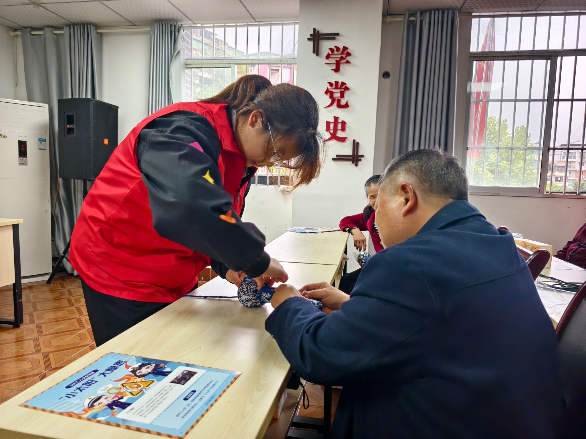 手工制作环节将活动推向了一个高潮,志愿者们与老人一一结对,共同完成布艾草包的制作。从材料分发到步骤讲解,从穿针引线到打结收尾,志愿者们都耐心示范、细致协助。一位老人自豪地展示着自己的艾草包说道:“这些孩子真有耐心,一步步教我们,让我这个从没做过手工的人也完成了作品。”活动现场,志愿者们不仅是手工老师,更是忠实的倾听者,倾听他们讲述生活中的点滴。十指翻飞之间,巧思流转,老人们在志愿者的陪伴下重拾手工的乐趣与成就感。这不仅是精美作品的完成,更是两代人之间情感的联结与温暖的传递,也正是志愿服务最动人的画面。