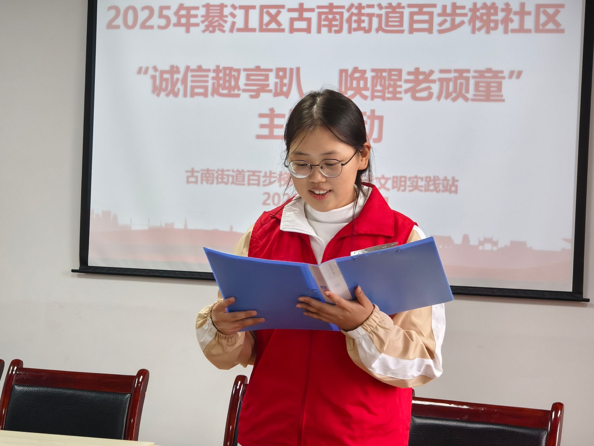 2025年11月14日下午,“指尖上的夕阳红”老人志愿服务专项支队、送“我”回家失物招领志愿服务专项支队和守望诚信志愿服务专项支队于百步梯社区成功举办“诚信趣享趴,唤醒老顽童”——关爱老人志愿服务活动。本次活动将诚信知识普及与趣味游戏相结合,在欢声笑语中为社区老人们送去了冬日的温暖与关怀。