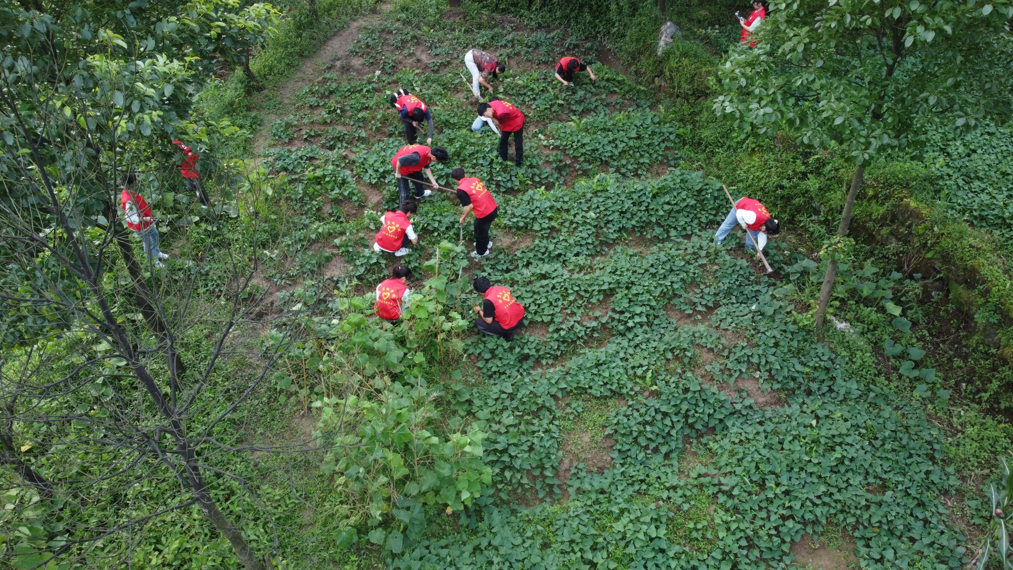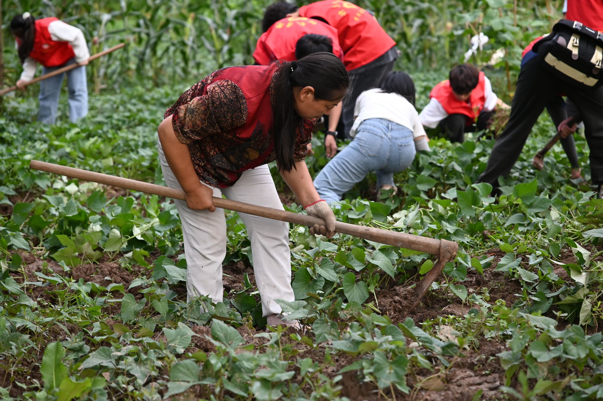 到农民中去,从田野中来。年轻学子需俯下身子,弯下腰去,将汗水洒在田间地头。午后阳光,温柔的洒在蜿蜒的田埂上。志愿者们手持镰刀与锄头躬身力行,除去红薯田间丛生的杂草。汗水在额间闪烁,喜悦在脸上洋溢。志愿者们辛勤劳作,草木新生美好萌芽。不久,红薯田埂上红薯叶将更繁茂,农户家中的鸡鸭猪羊都会有新鲜的食物。