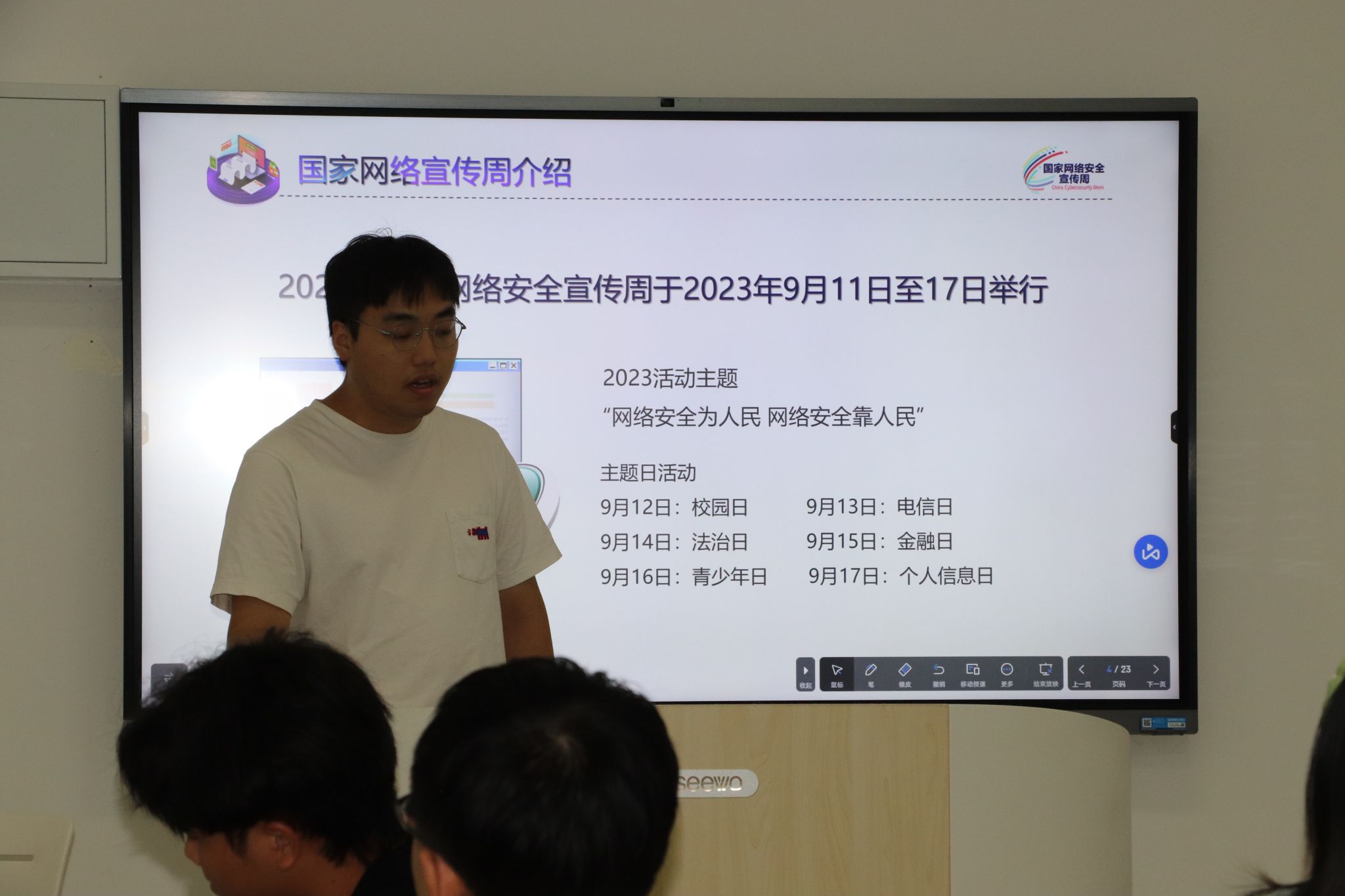 2023年国家网络安全宣传周于9月11日至17日在全国范围展开。为进一步完善学校网络安全建设,增强学生的网络安全教育意识,加强对学生网络安全法的宣传普及,切实营造安全、健康、文明、和谐的网络环境,崔向灵、柏金江老师携手计算机学院、数字经济与信息管理学院异科导师班及勤工助学学生团队在2023年9月8日下午,邀请到我校綦江校区网络与信息管理中心张正梁老师,围绕我国网络安全法律法规体系的内容,进行了一次“网络安全为人民,网络安全靠人民”为主题的宣传活动。