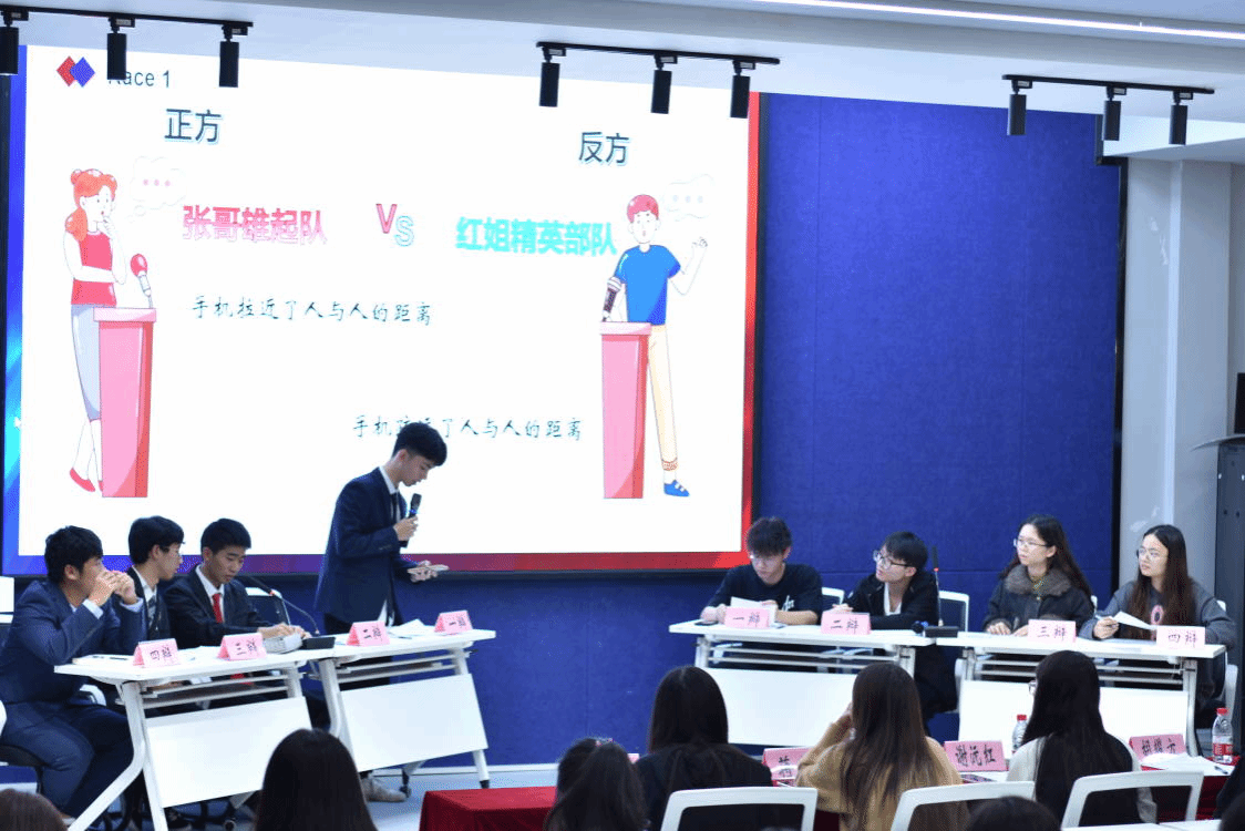 自手机问世,在给人类带来便利的同时也使人类之间变得淡薄和冷漠。那手机究竟是拉近人们的距离还是疏远人们的距离?正方——张哥雄起队以手机功能为切入点,深层次体现了人与手机的联系,将手机视作了人与人之间沟通的桥梁,它承载着远方故人的情思。而反方——红姐精锐队以人与人之间的情感为突破口,将原本淡薄的情感和已存在的深情厚谊作比较,反驳手机的承载作用,从而提出手机会疏远人们距离的观点。双方三寸之舌,强辩手机对人们情感距离的影响,正反两方的辩论也让在座的听众陷入沉思——情谊的疏远是原本存在还是手机使然?
