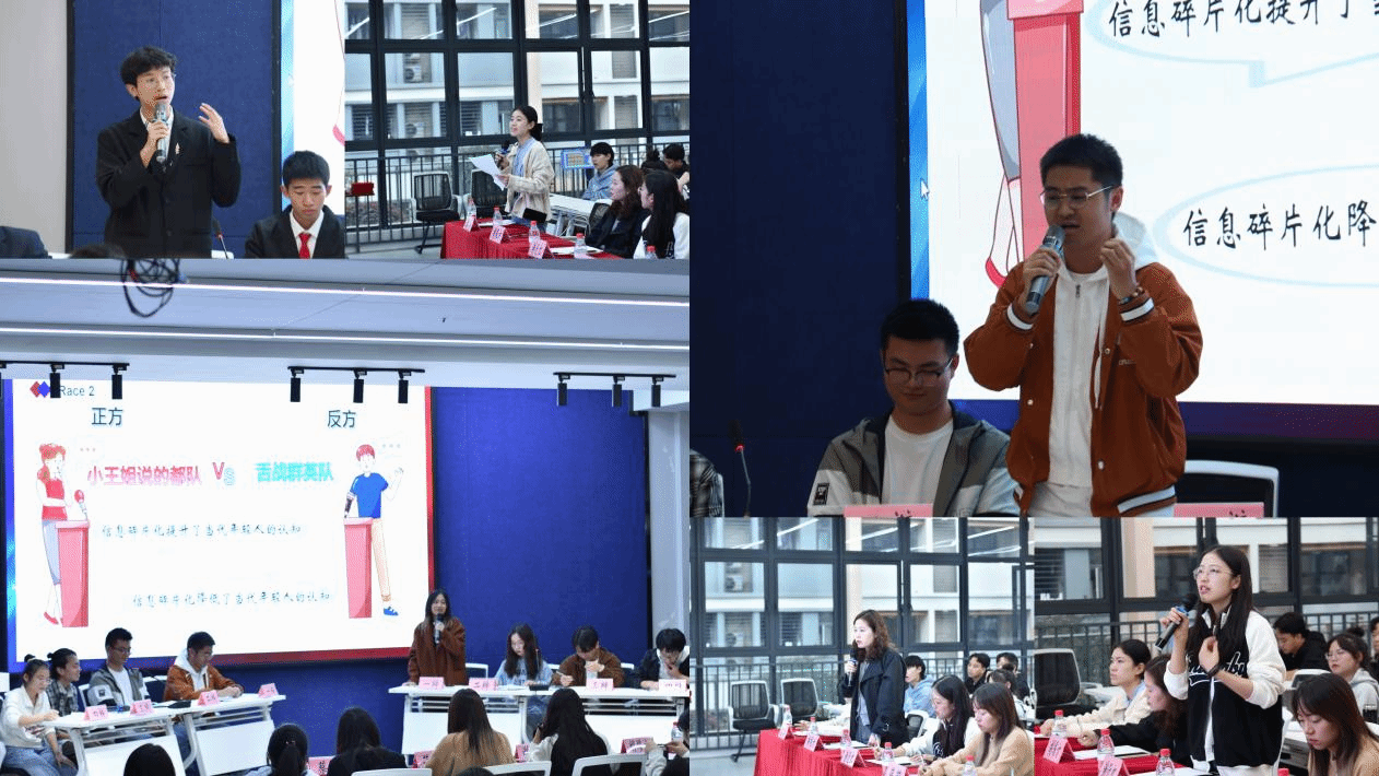 随着科技的稳步发展,信息碎片化模式随处可见。它是否会降低年轻人的认知能力?正方——小王姐说的都队以抖音为切入点展开辩论,提出利用信息碎片化是一种有益的学习方式。反方——舌战群英队也抓住信息碎片的破绽,强烈反驳信息碎片化是一种有益的学习方式,认为信息碎片化将影响年轻人的学习和工作效率。赛场上双方思维敏捷,条理清晰,辩论愈发激烈,同座下七十几名学子共同见证这场知识的盛宴。