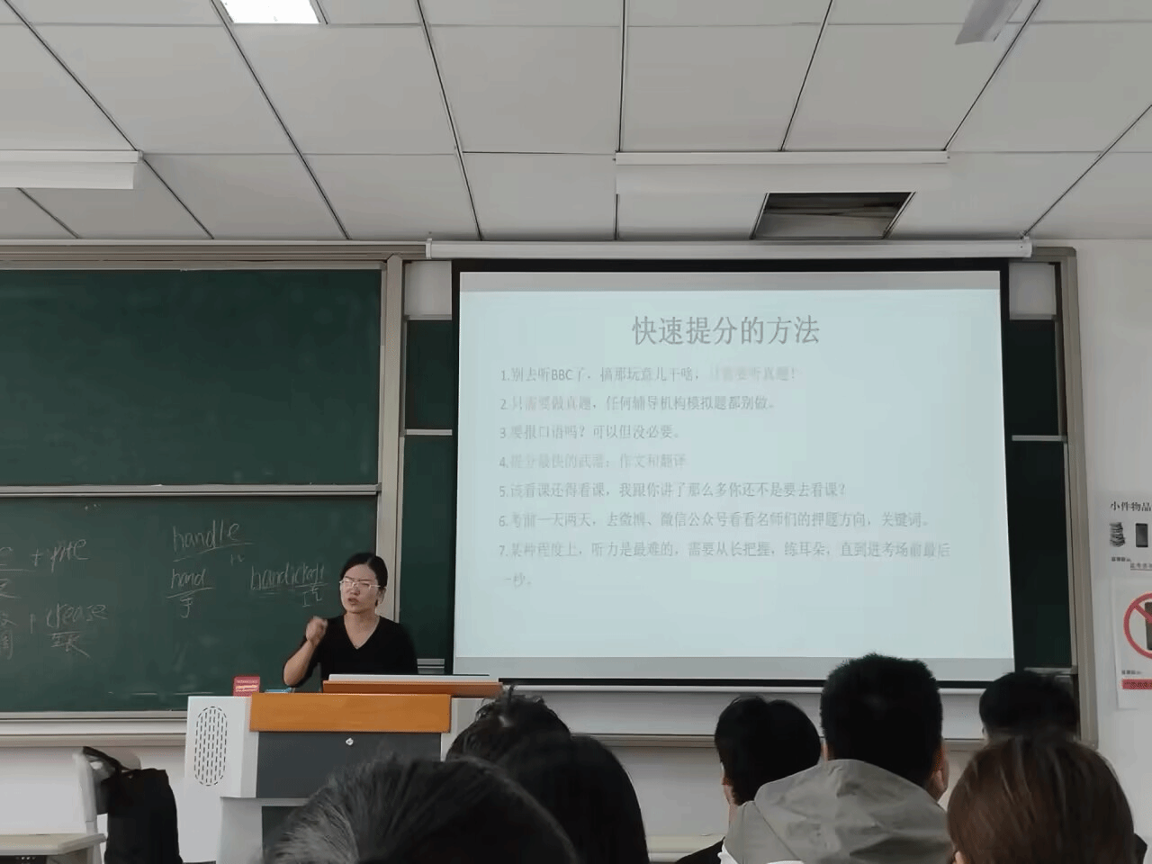 善作始于青年,善成造就青春。分享会逐渐进入尾声,邓海龙学长在黑板上写下ashore,希望在座的各位同学都能在四级考试中超常发挥,成功上岸。另外杨丽娟老师也向我们分享了一些快速提分的方法,距离考试只有两个月的时间,在这个阶段尽可能掌握一些做题技巧,提高我们的正确率。在准备四级考试的路上,做到只争朝夕,不负时光,以破关斩将的决心,按下奋进的快捷键,不仅在四级考试上开足马力,也在今后的道路上创就新辉煌。