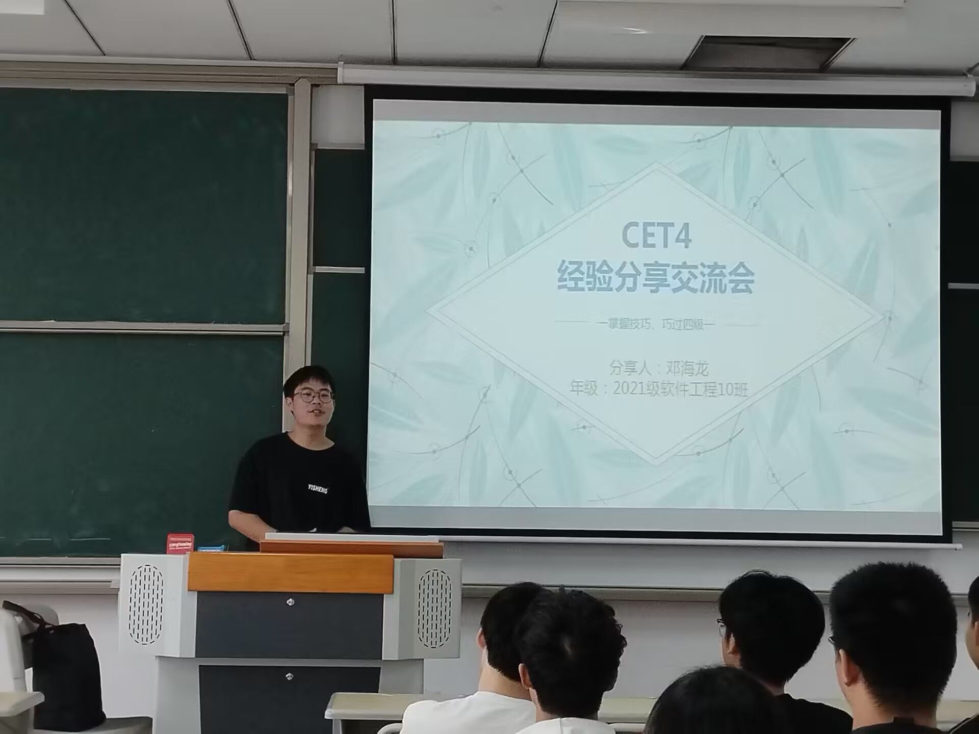 为了让同学们了解全国大学英语四级考试的具体流程,有针对性地对英语四级考试进行复习、备考,2023年10月17日,杨丽娟老师组织2022级计算机科学与技术10班的同学在勤者楼302开展了英语四级经验分享交流会,本次分享会特别邀请到了2021级软件工程10班邓海龙学长与大家分享和交流自己的备考经验。