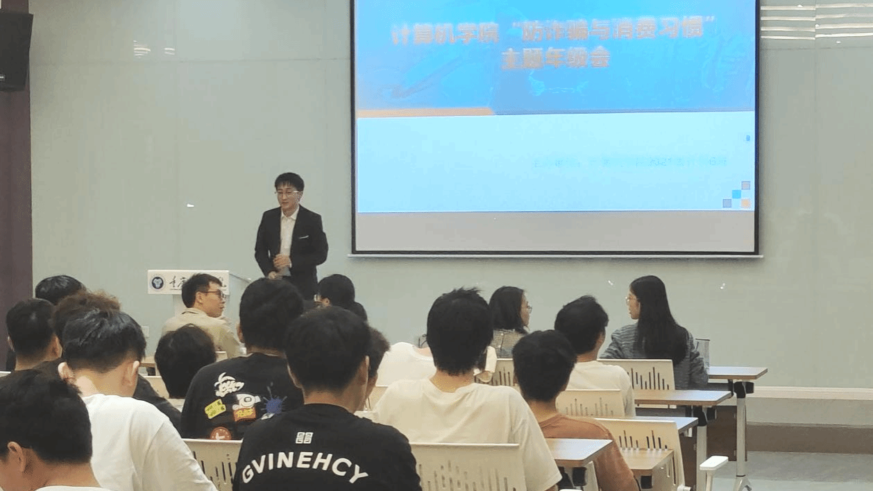 随着网络的极速发展,信息技术的进步,各种网络诈骗层出不穷。其中每年校园网络诈骗案例层出迭见,高校是电信网络诈骗的重灾区,校园网络诈骗已经成为一个严峻的社会问题。为了提高同学们的反诈、防诈、防骗意识,保护好自己的“钱袋子”,计算机科学与技术6班同学于2023年10月18日下午19:30在观云书院冬至多媒体教室开展了以“强化免骗意识,共建安全消费”为主题的年级会。年级会邀请了大数据学院学工办主任李进老师、淬炼商学院朱思琪老师,计算机学院学工办主任谢沅红老师和辅导员老师杨桂华。计算机学院2021级计科1-10班同学代表共同参与本次主题年级会。