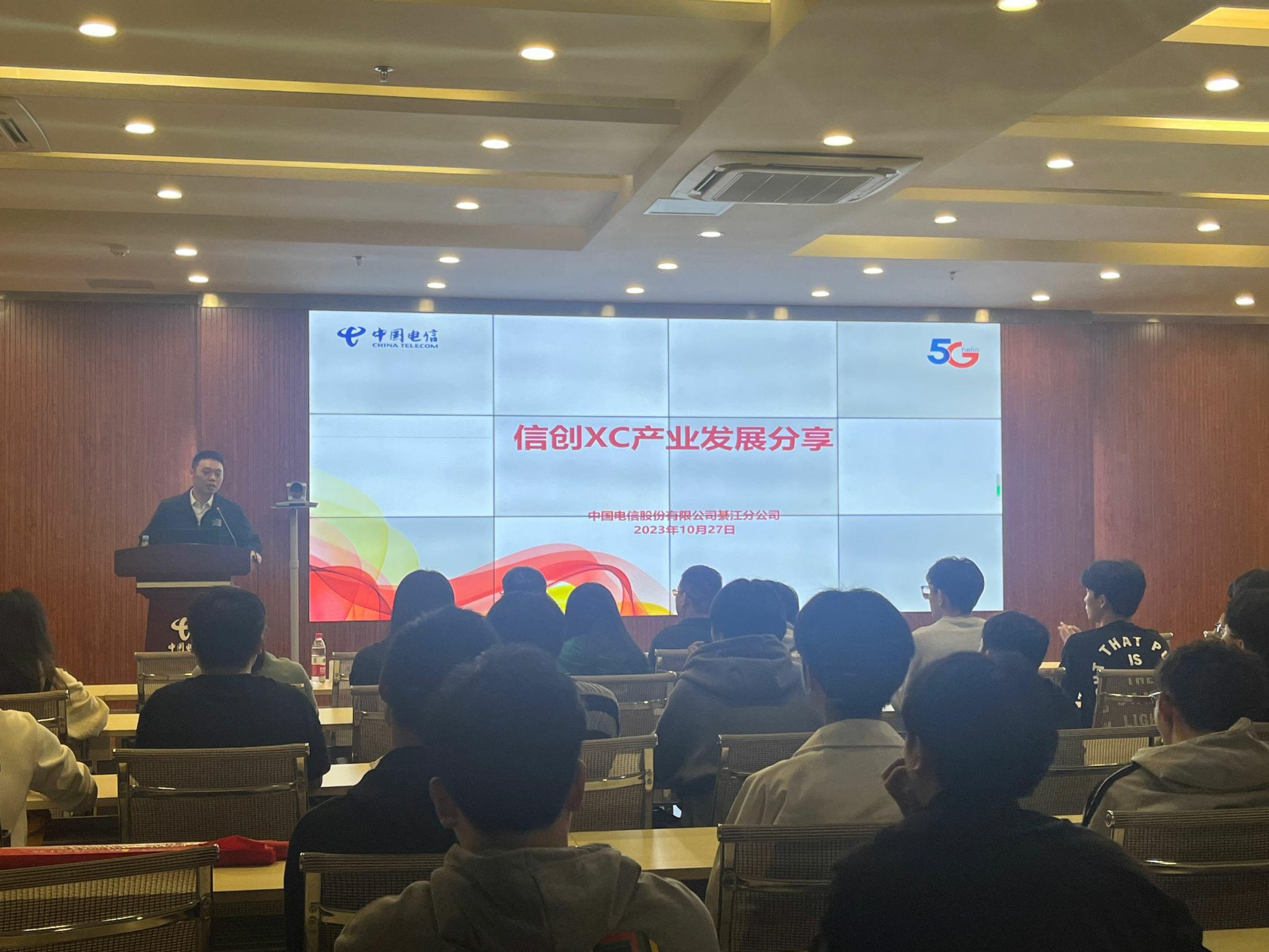随后,由专业的科技人员为我们讲解了信创产业的发展状况,使我们了解到信创发展的必要性和网络安全的重要性。会后,电信公司领导带领我们参观了公司的机房,详细介绍了机房内部各个设备的运作和作用,使我们深刻体会到电信公司在相关工作上的专业性和机房设备的严谨性。