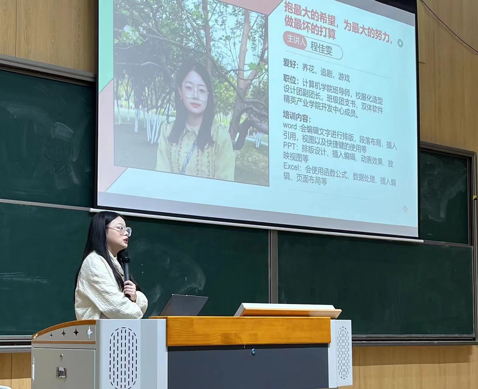 此次培训有幸邀请到来自2021级计算机学院计算机科学与技术专业10班的程佳雯学姐主讲。通过演示和讲解的方式,她详细介绍了如何使用Word文档创建和编辑文档,如何使用Excel表格进行数据分析和可视化展示,以及如何使用PowerPoint制作高质量的演示文稿。