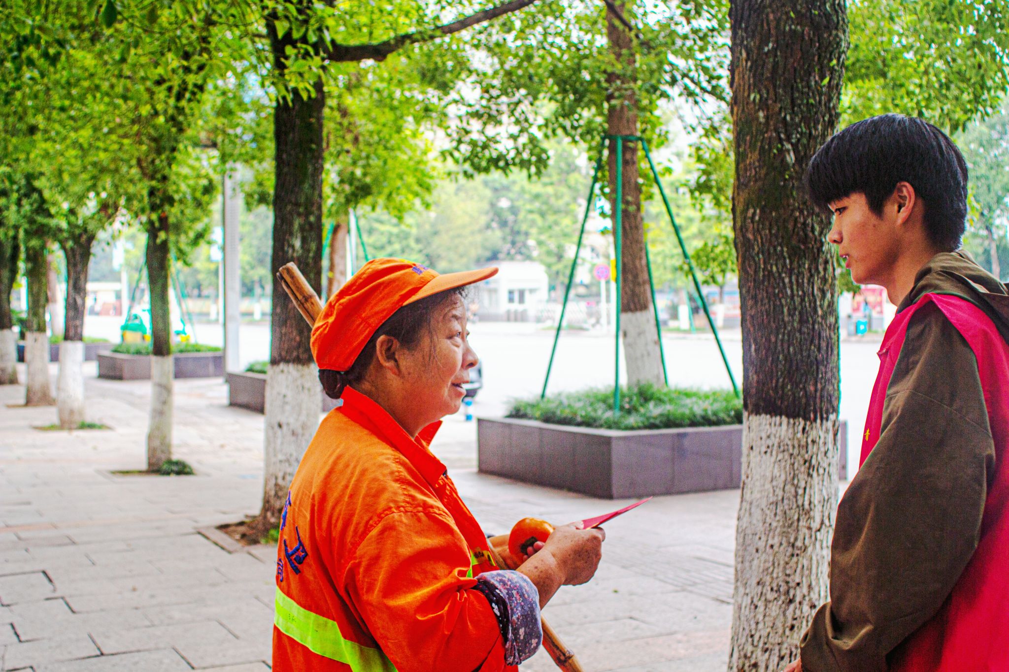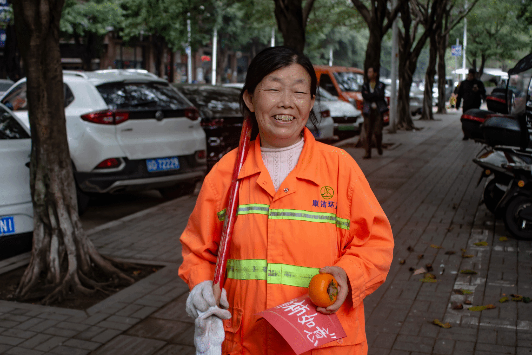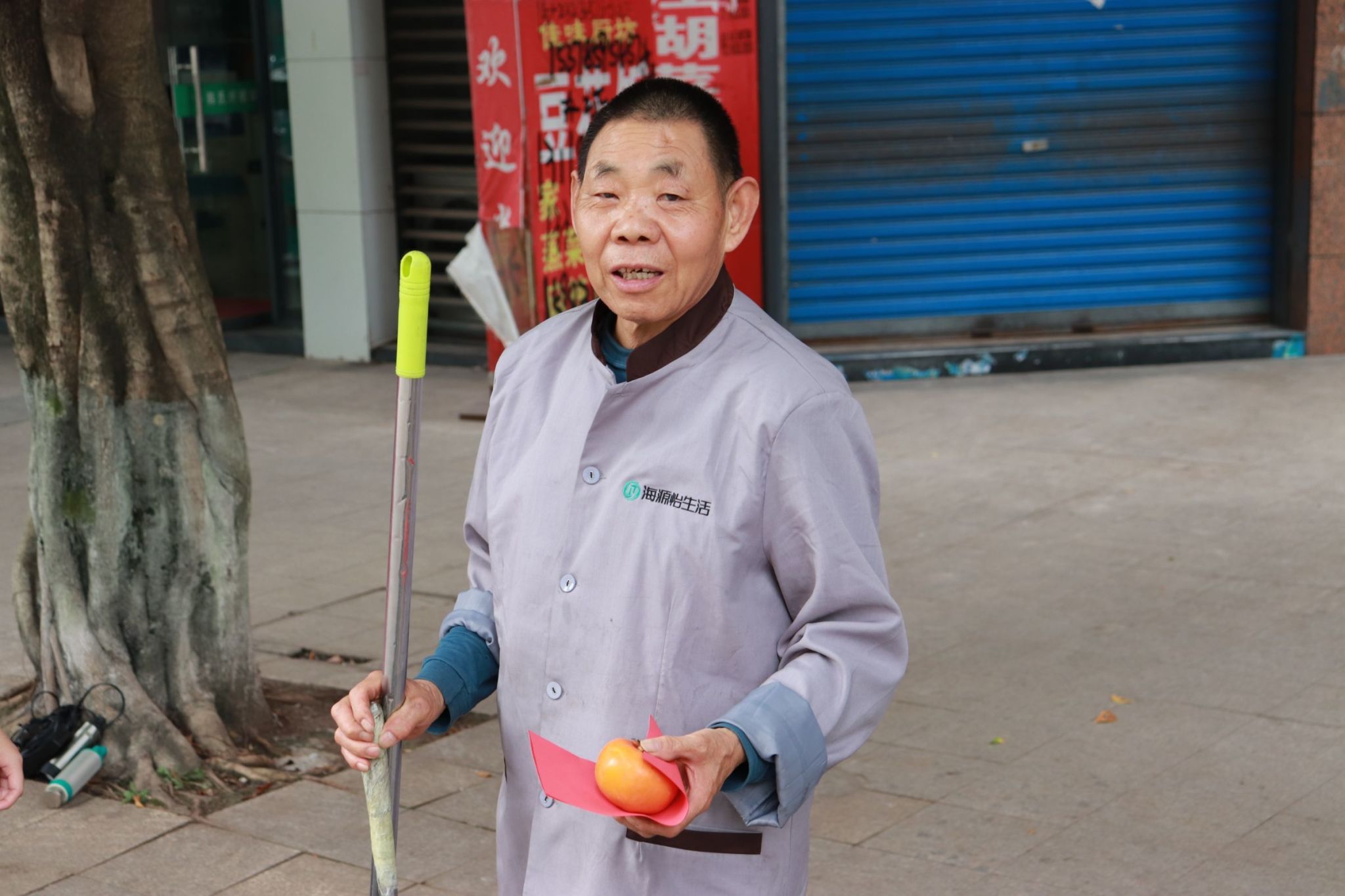 去到天星大道寻找“微尘”,并送出提前准备好的落叶书信祝福和福柿,期间,志愿者还和“微尘”们进行了简短的交谈,从他们的口中,了解到了这些工作岗位的不易。原来,他们也有过不被理解的时候,但是他们并没有因此而抱怨,丢弃职责所在,而是默默坚守自己的工作岗位,有一份光,发一份热,为社会作出实实在在的贡献。