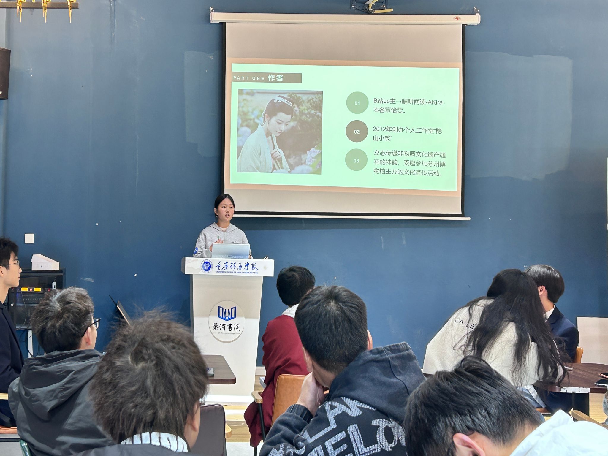 马月林同学随之以“春已归来,看美人头上,袅袅春幡”开篇。以《手工缠花入门指南》为主题分享心得体会。她提到我国现存非遗种类繁多,并非每一门技法都能够得到传承。这其中有人员因素,也有市场因素。许多老一辈的非遗者是不愿意让自己的孩子以非遗为正式职业的,因为养不活自己。而部分接触到非遗的人,也可能在光怪陆离的世界里迷失了初心,半途而废,放弃继承非遗技艺。值得庆幸的是,如今相关部门注意到了这个现象,不少地方都开展了“非遗进校园”,“教育从娃娃抓起”等活动。同时老一辈人匠心依然,尽心尽力将自己的本领传递下去。马月林同学表示,在学习的过程中,更要初心如磐,千锤不悔。陈师芹老师随之发表了感想:今天流传下来的非物质文化遗产是经过了多少岁月的洗礼和人文的考验,它们是我们的精神财富和文化能量,它们不仅是我们的文化身份标识,同时也给予我们一份文化自信和尊严。