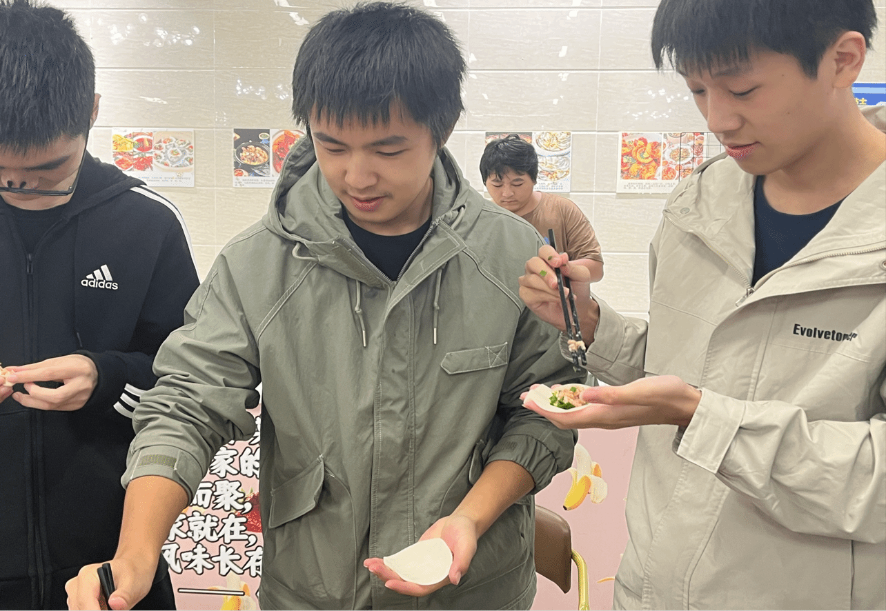 吴明杰与彭杰主力包韭菜饺子,余倩与唐李韦同学爱吃香菇馅,就专攻这一类型,大家七手八脚,在哄笑中,包出形状不一的饺子。在这场包饺子聚餐活动中,积极参与,热情洋溢,活力四射。现场的包饺子工作台上,摆放着琳琅满目的馅料和饺子皮,同学们如同身手不凡的饺子大师,亲手制作饺子,畅聊欢笑,共度这段温馨欢乐的时光。
