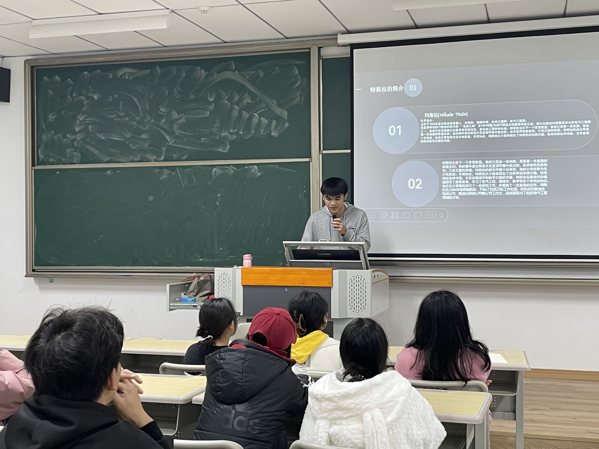 接着,何荣浩同学分享了《特斯拉传》,通过讲述和主题人物相关的生平简介与生活条件,引起纷纷响应,在场同学们争先分享着自己通过无线电传输与接受设备对自己生活产生的影响,在场同学从过去的科技发展情况,再聊到未来的传输方式,各抒己见,讨论热烈。经过对科技的讨论后,何荣浩同学又说到了特斯拉的遗产,他的发明和贡献成为了现代电力系统、射频技术和无线电通信的基石;他的梦想和构想也启发了后人继续探索科学和技术的可能性。如今,特斯拉被誉为一位伟大的先知和发明家,他的名字成为了许多科技企业和机构的命名来源。