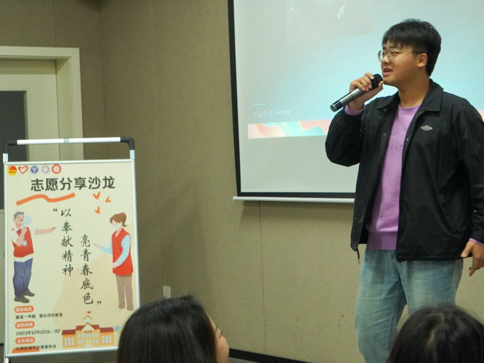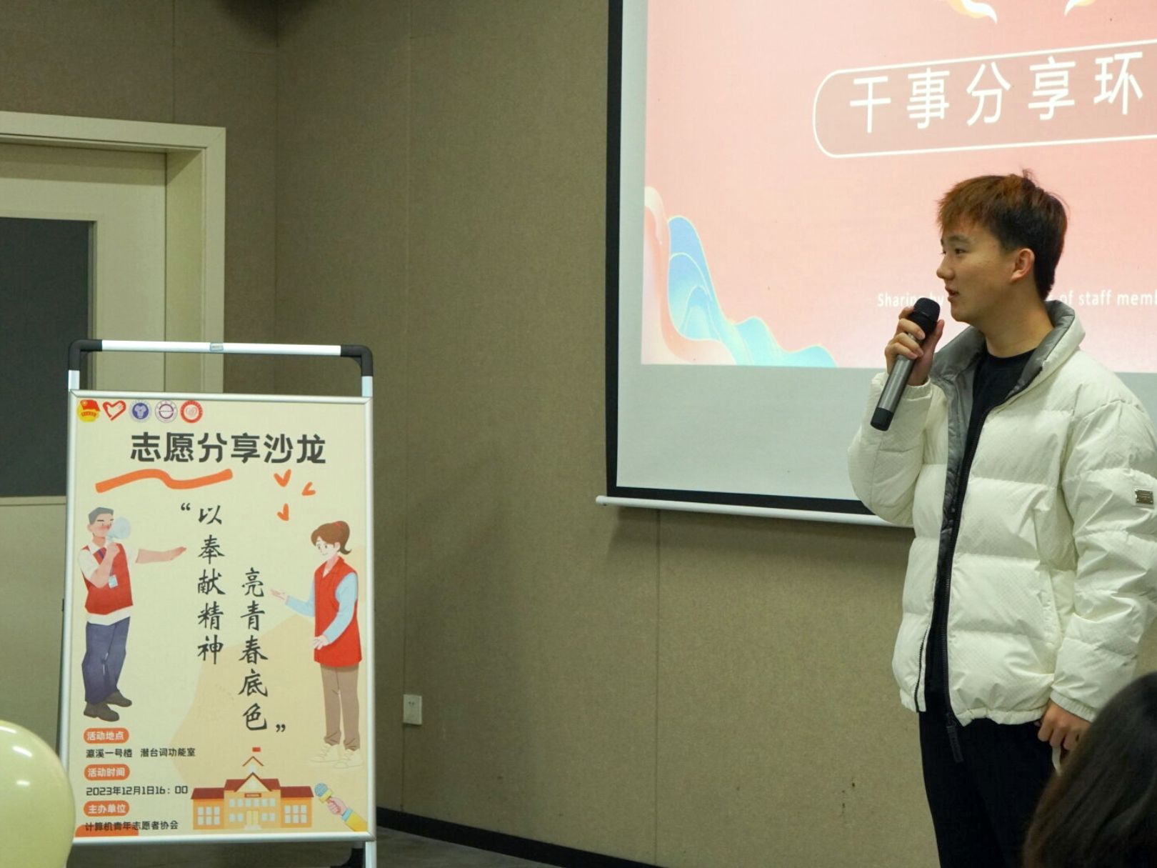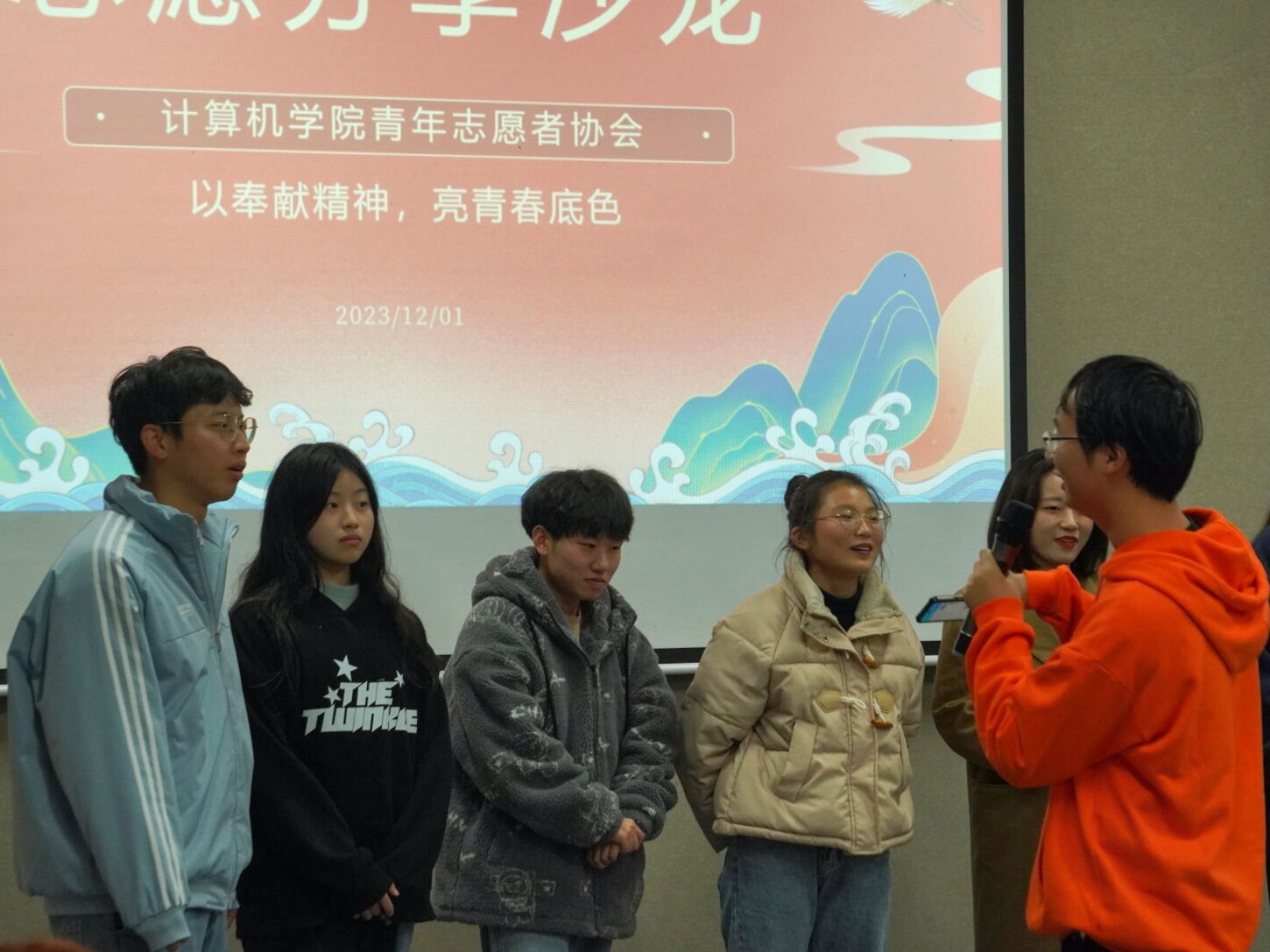 1985年的今天,为大力宣传、赞扬和倡导志愿者为社会义务服务的重要作用与奉献精神,联合国正式确定每年12月5日为“世界志愿者日”。志愿服务是个人能力提升的重要标志,在第38个“世界志愿者日”来临之际,为了推动志愿事业的发展,促进青协干部干事的相互了解。2023年12月3日15:40,计算机学院青年志愿者协会于瀛溪书院潜台词影音室开展了“以奉献精神,亮青春底色”为主题的志愿分享沙龙。