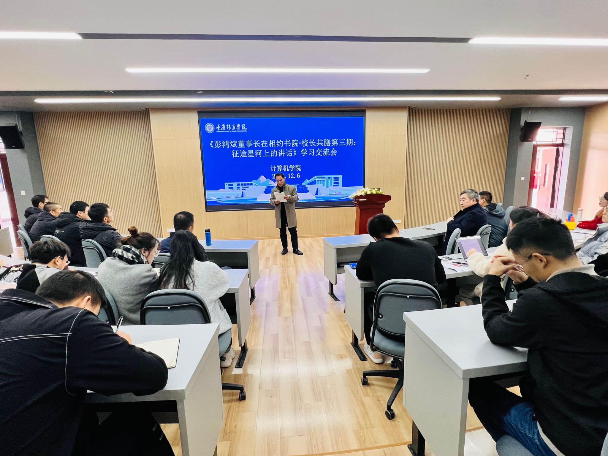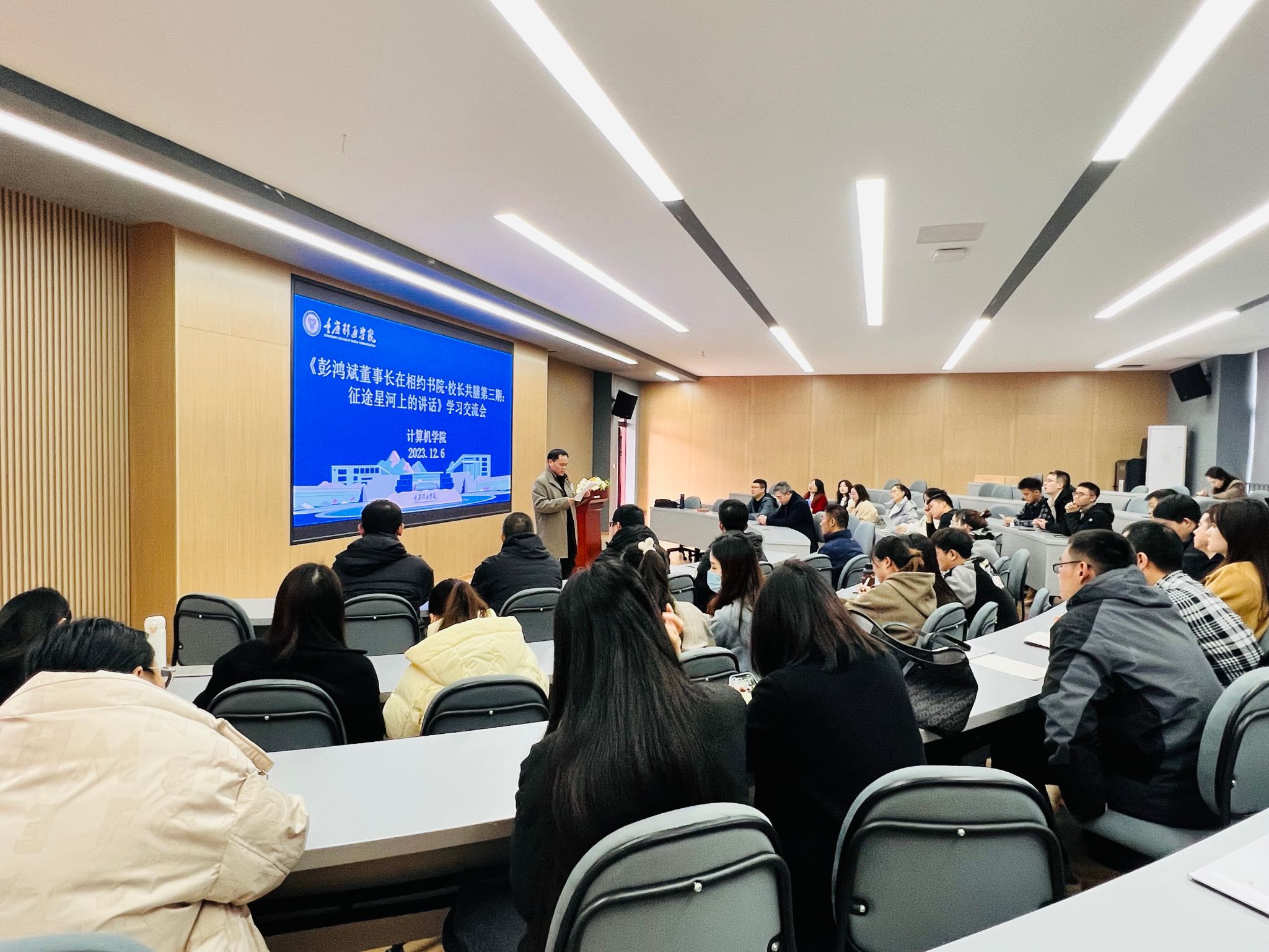 为贯彻落实《彭鸿斌董事长在相约书院·校长共膳第三期:征途星河上的讲话》,确保教职工立足自身工作和思想实际,理解彭董事长讲话的基本内涵,提高学习效率和观测工作取得实效,计算机学院在12月6日下午于智者楼304组织全院教职工学习董事长讲话精神。会议由计算机学院副院长林泽金主持,学院全体教职工共同参加。