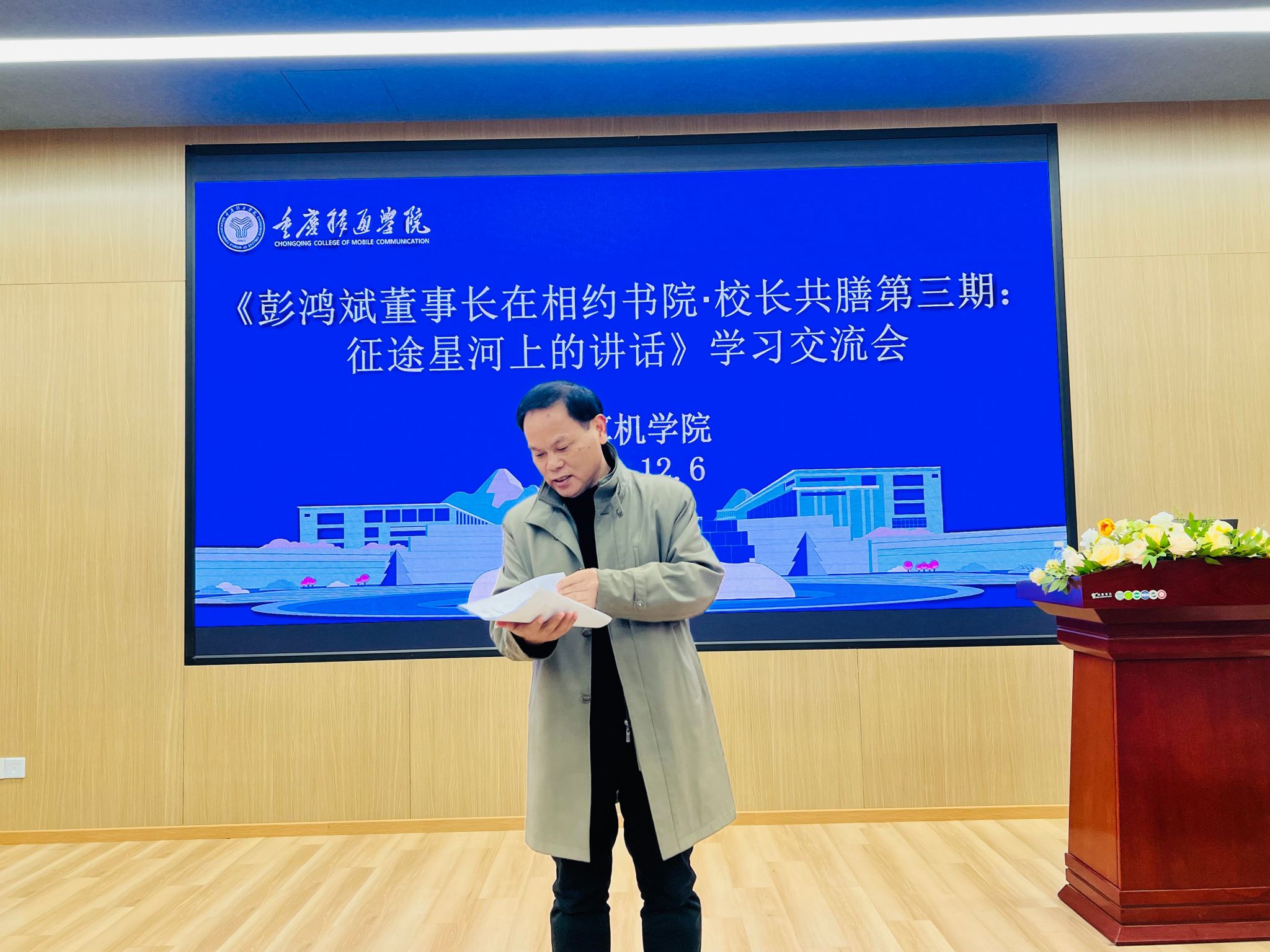 在这次学习交流会上,林院长首先领读了彭鸿斌董事长在《相约书院·校长共膳第三期:征途星河上的讲话》稿件。